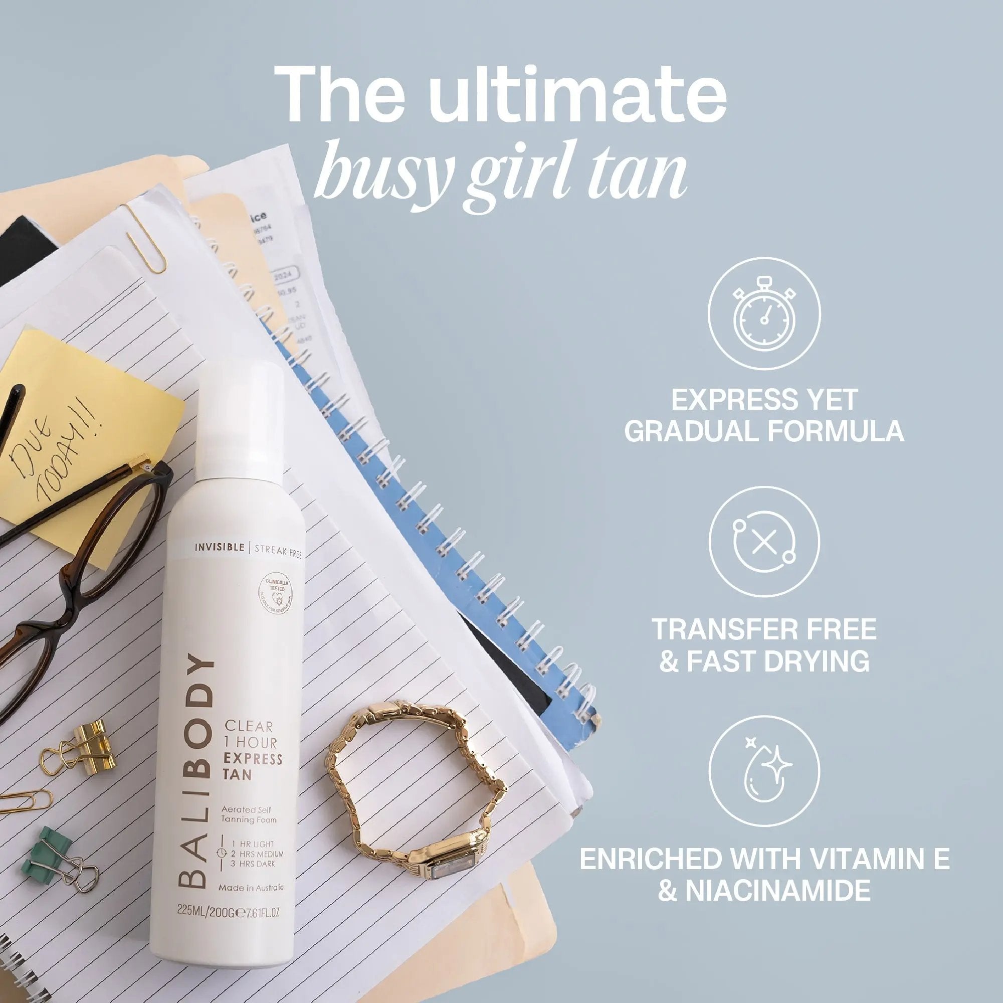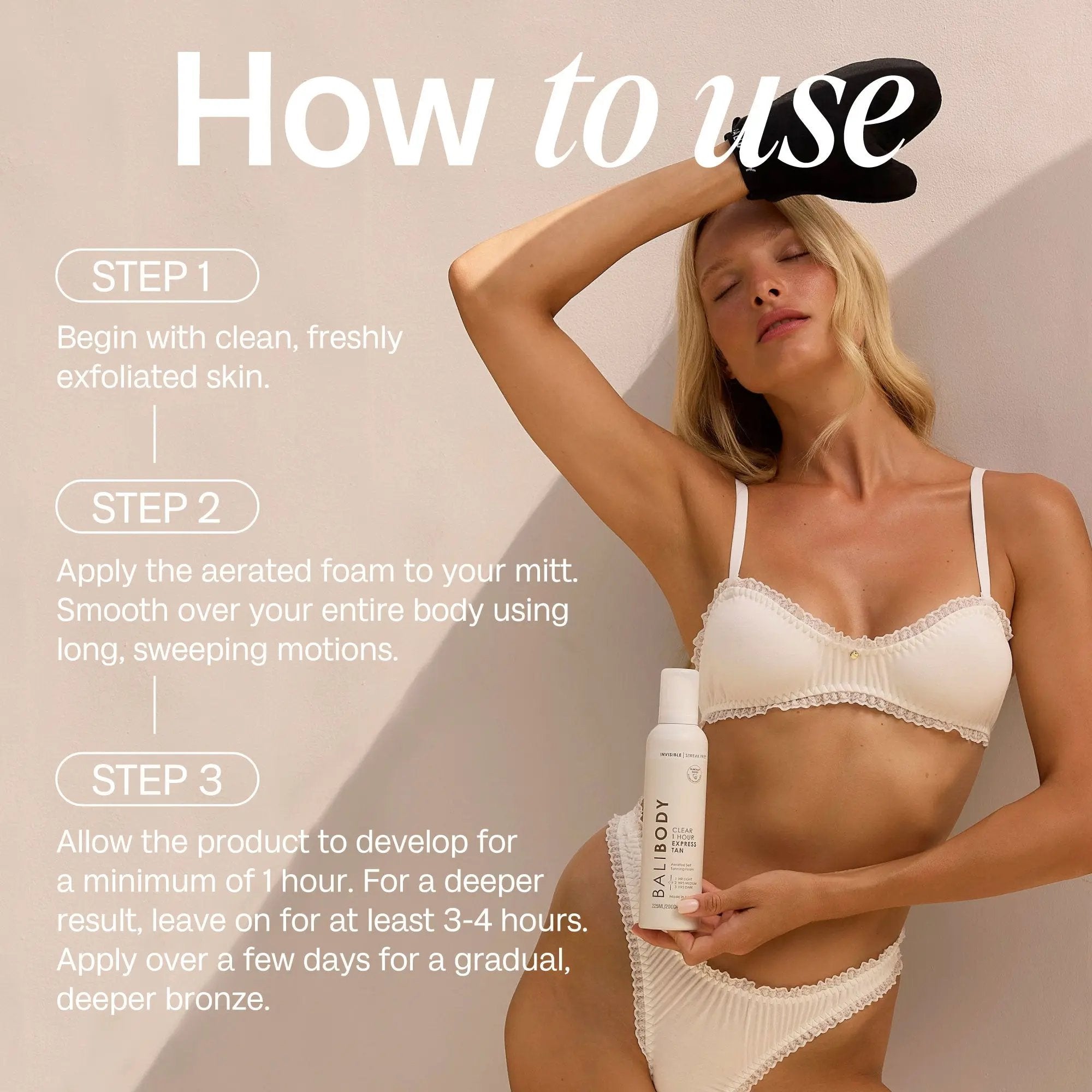 De Bali Body 1 Hour Express Clear is jouw nieuwe go-to voor een vlekkeloze tan zonder gedoe! Deze luchtige, gewichtloze mousse is volledig transparant én sneldrogend, geen geknoei, geen vlekken, geen overdracht op je kleding. Of je nu in een uur een natuurlijke glow wil of liever laagje voor laagje opbouwt tot jouw perfecte bronze, deze tan past zich aan jouw tempo aan.