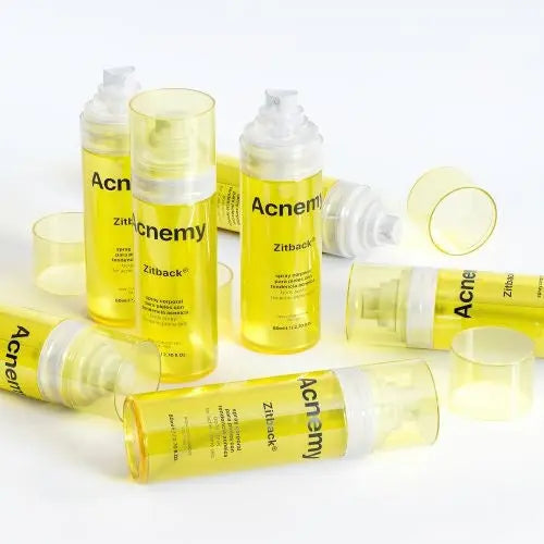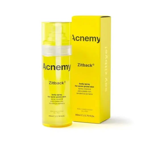 De Acnemy Zitback Body Spray is een sneldrogende spray speciaal ontwikkelt om acne op je lichaam te behandelen. De spray bevat BHA- en AHA-zuren die ervoor zorgen dat puistjes uitdrogen. Citroenwater is toegevoegd als natuurlijke exfoliant.