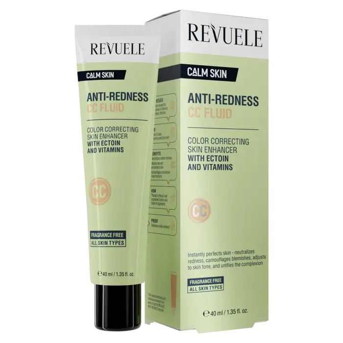 De Revuele Anti-Redness CC Fluid is jouw go-to als je last hebt van roodheid en op zoek bent naar een egale, natuurlijke look. Deze fluid heeft een zachtgroene tint die roodheid optisch neutraliseert én zich aanpast aan je huidskleur dankzij beige pigmentmicrobolletjes. Het resultaat? Een fluweelzachte, egale teint met een airbrush-effect, zonder dat het eruitziet alsof je make-up draagt.