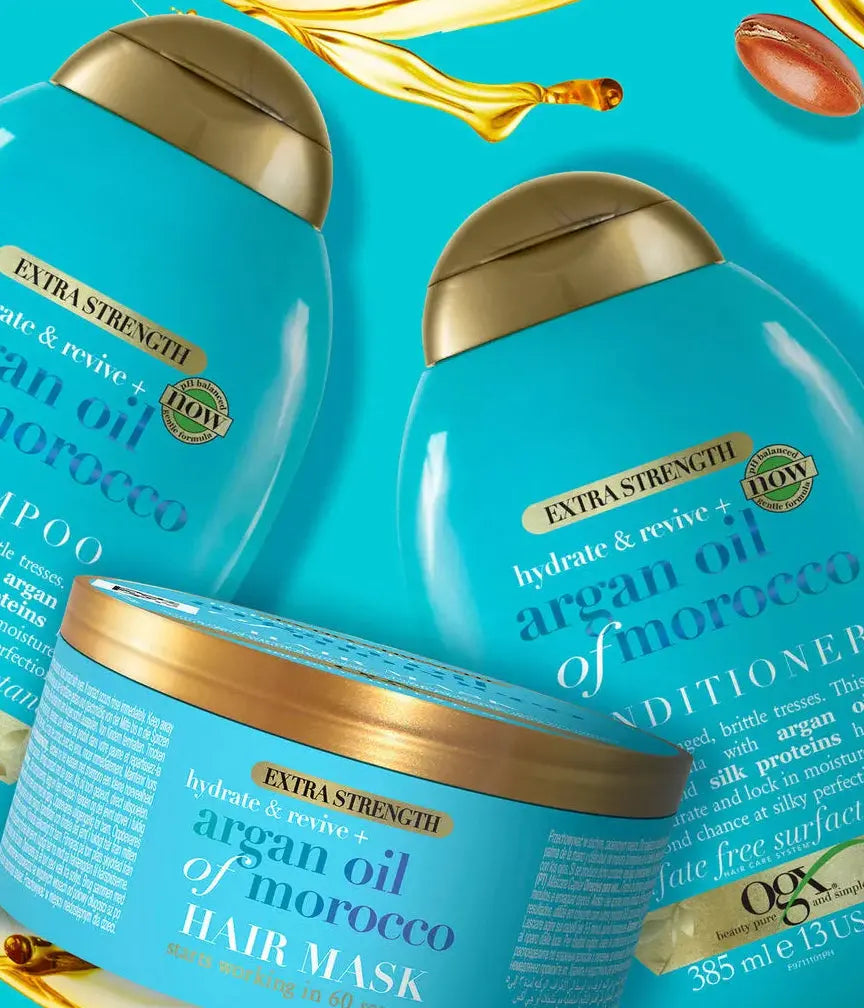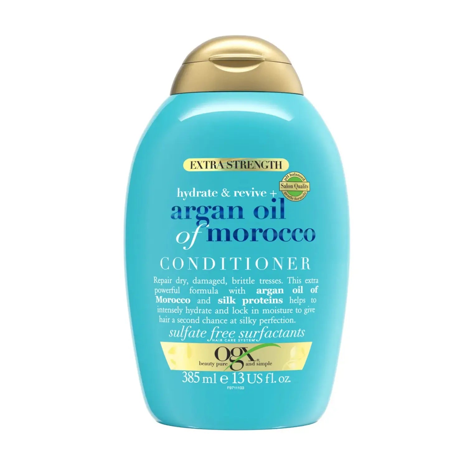 De OGX Hydrate & Revive Argan Oil of Morocco Conditioner is jouw redder in nood voor droog, beschadigd of broos haar! Deze intens verzorgende conditioner zit boordevol kostbare Marokkaanse arganolie en zijdeproteïnen die je lokken diep hydrateren, herstellen en versterken. Het resultaat?