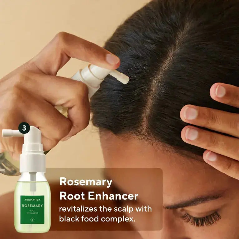 - Gebruik eerst de Rosemary Root Enhancer door te schudden en direct op de hoofdhuid te sprayen, vooral op probleemzones.