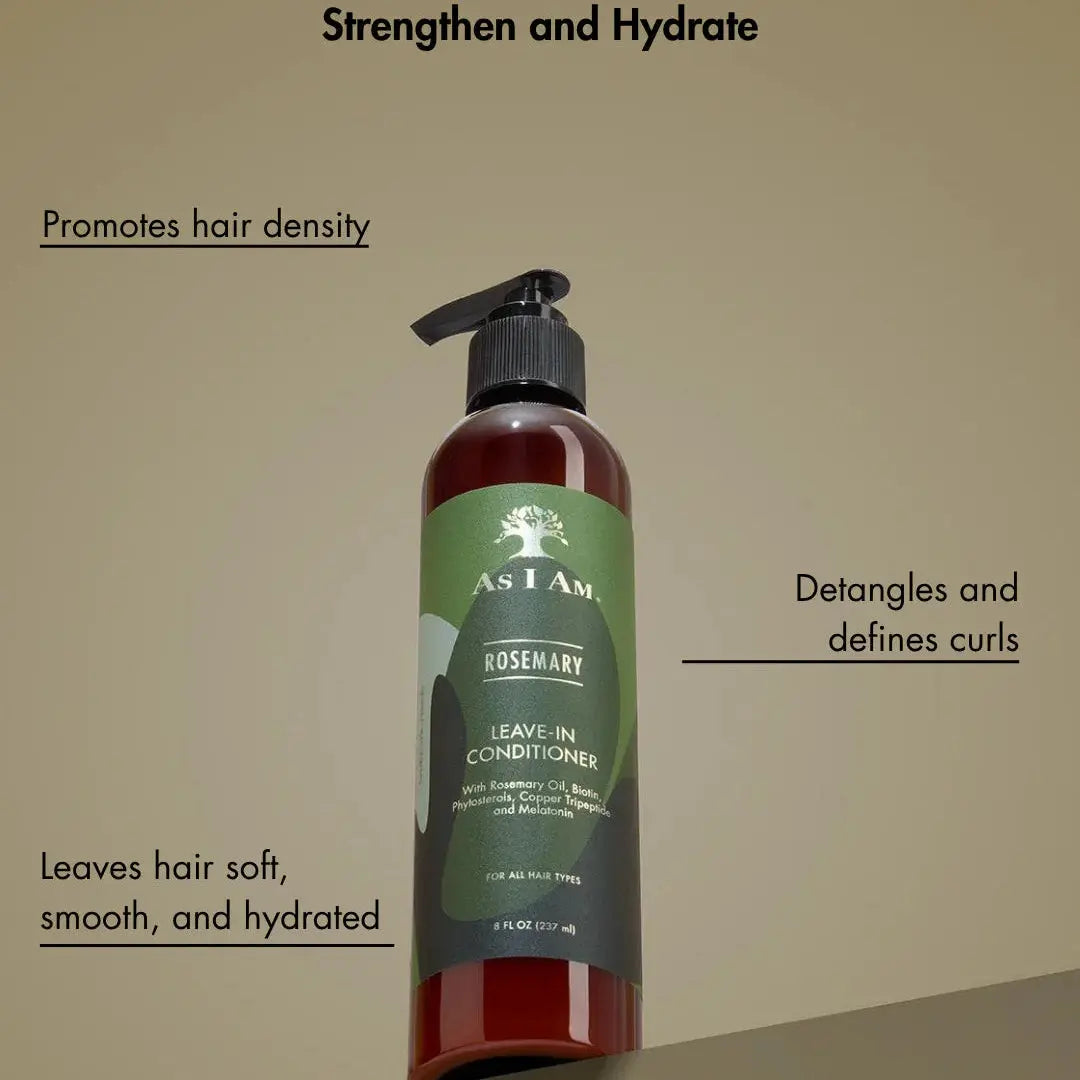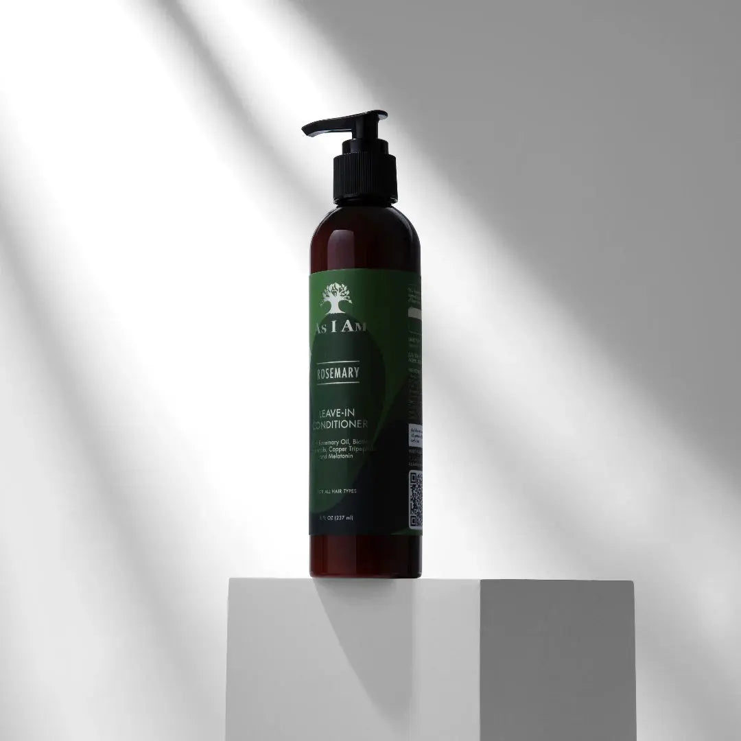 De As I Am Rosemary Leave-In Conditioner is dé verzorgende must-have voor wie droomt van gezond, sterk en gedefinieerd haar. Deze leave-in zit boordevol krachtige ingrediënten zoals 10% rosemary oil, biotine, saw palmetto en melatonine om je haar te hydrateren, ontwarren én te versterken, van wortel tot punt.