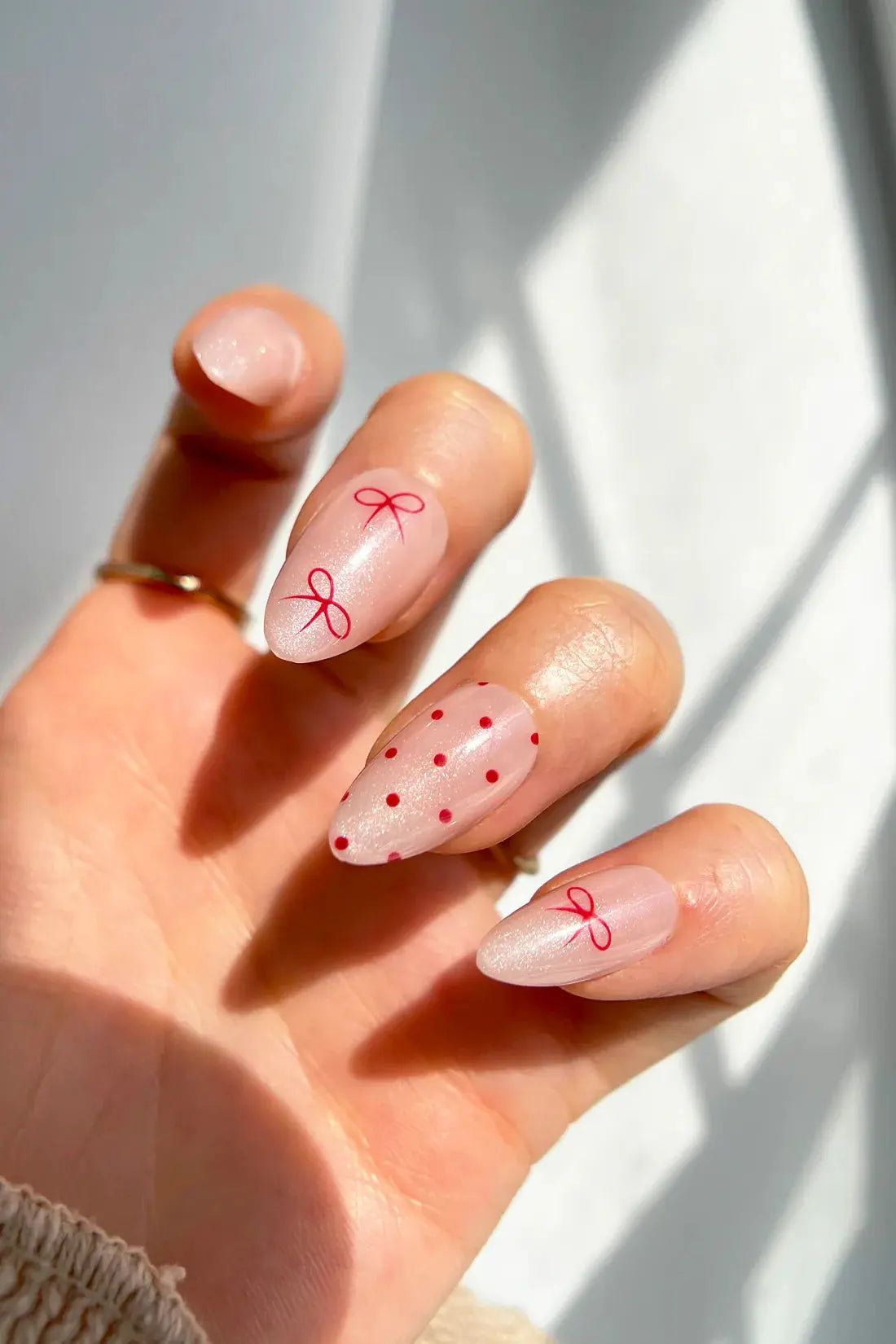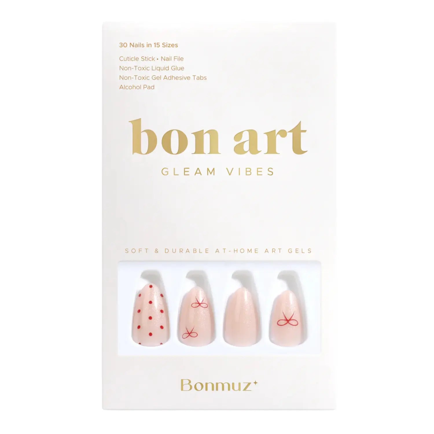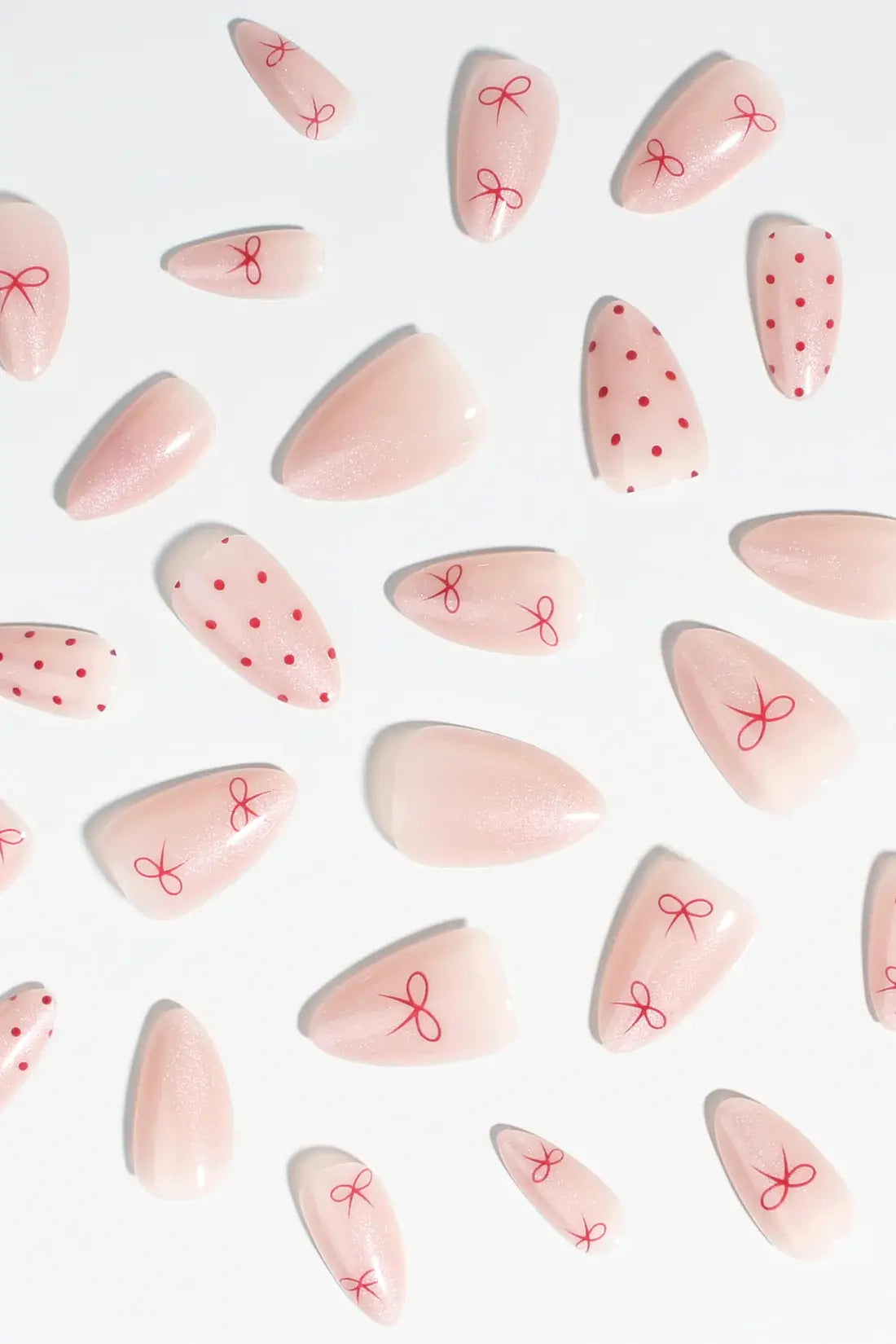 De Bonmuz Press-On Nails Berry Bows geven je manicure een speelse maar verfijnde twist. Deze set combineert diepe rode strikjes en polka dots op een zachte, subtiel shimmery basis voor een girly look met een sophisticated edge.