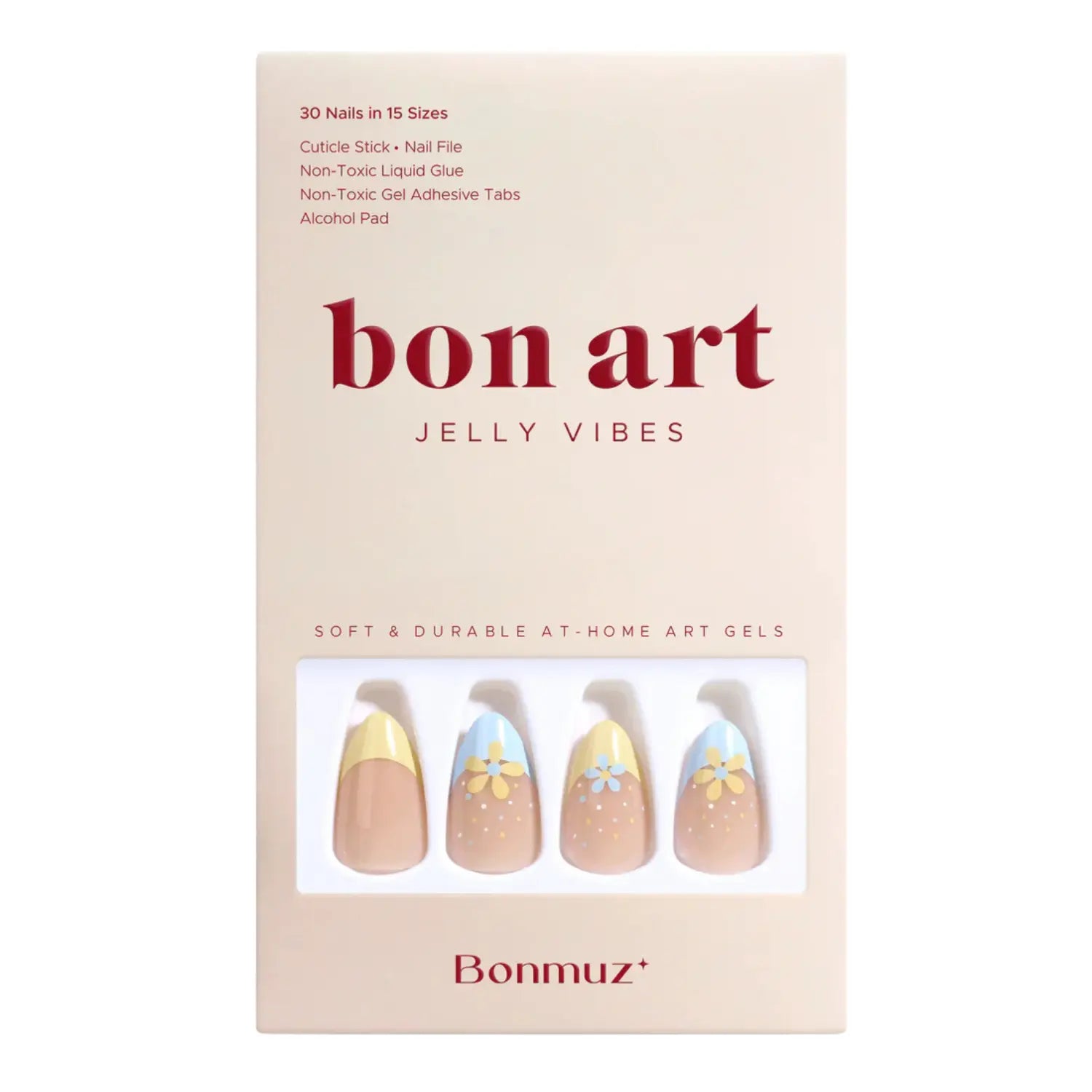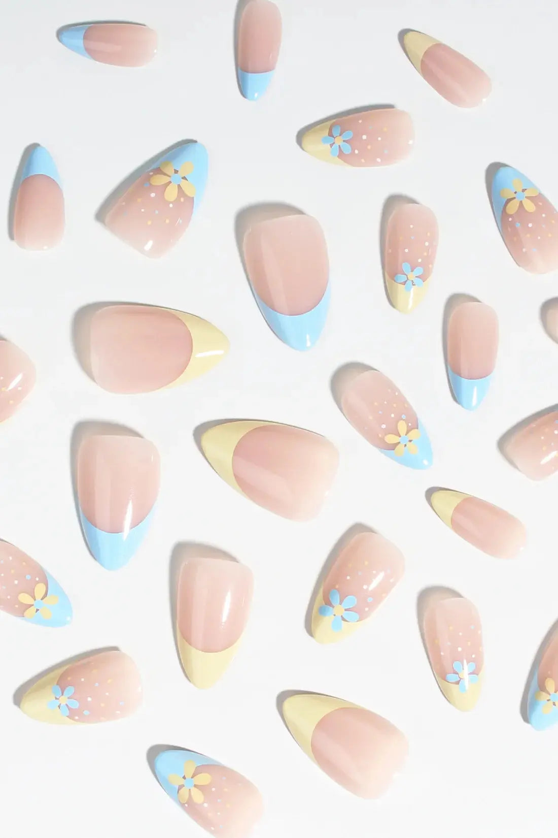 De combinatie van subtiele kleuren en bloemige details zorgt voor een whimsical maar elegante look die perfect is voor elke dag. Een moderne twist op tijdloze beauty die jouw handen direct een verzorgde en zonnige vibe geeft. Met deze premium press-on nails geniet je van high quality elegance en non damaging wear voor een duurzame at home manicure.