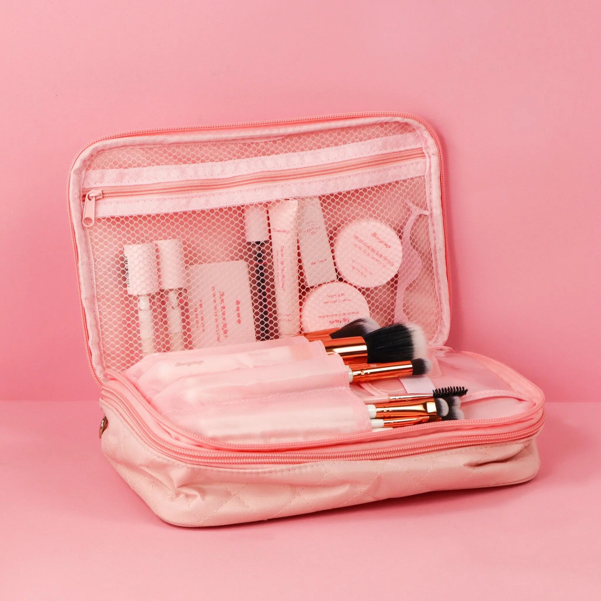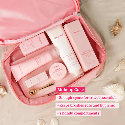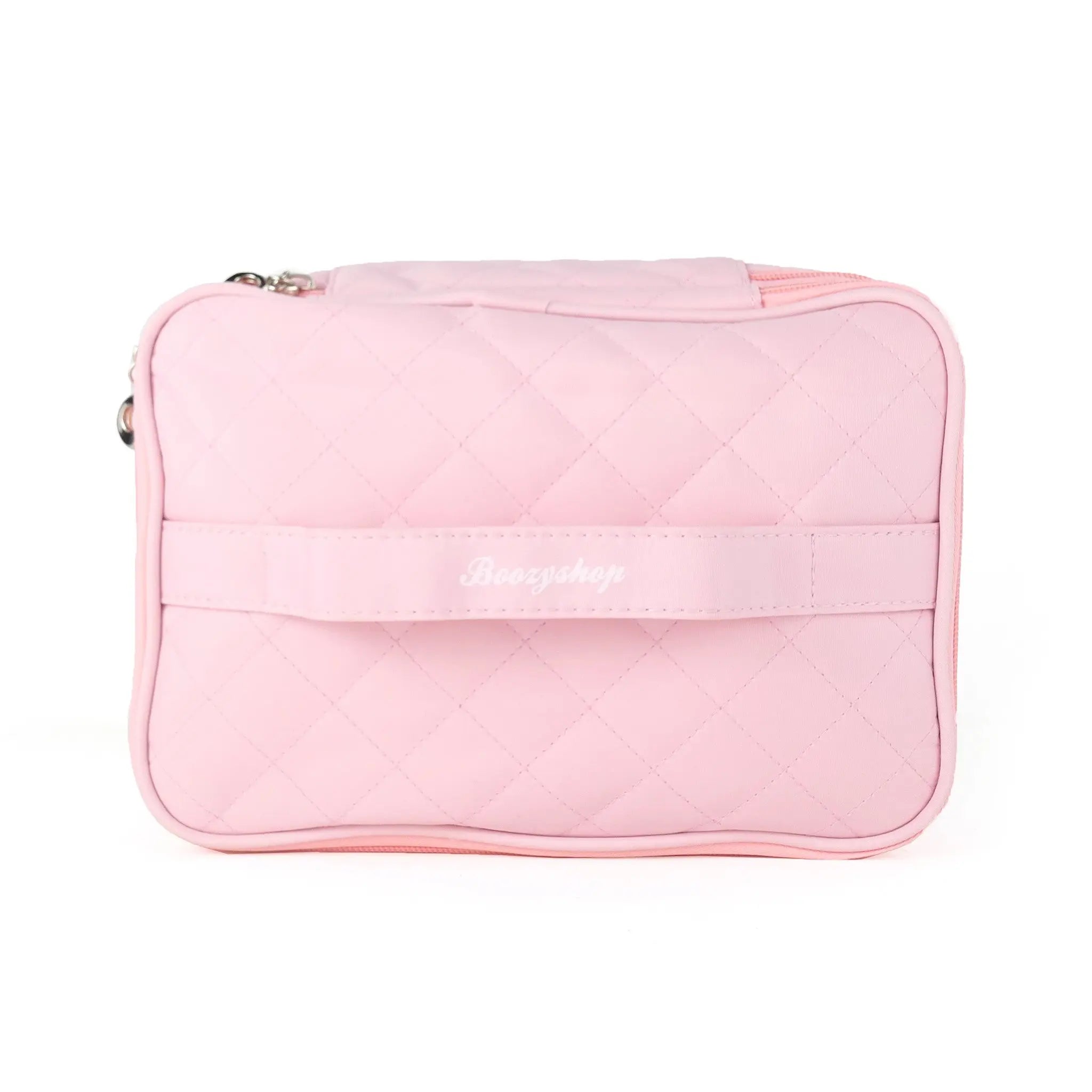 Boozyshop Makeup Case wordt jouw nieuwe favoriete travel buddy! Deze super mooie zacht roze makeup tas heeft 2 handige vakken. Jij hoeft je nooit meer af te vragen hoe je je kwasten, makeup en toiletartikelen veilig en hygiënisch vervoert.
