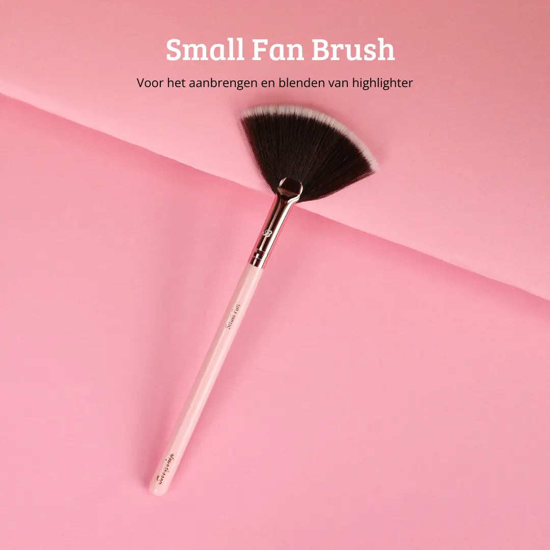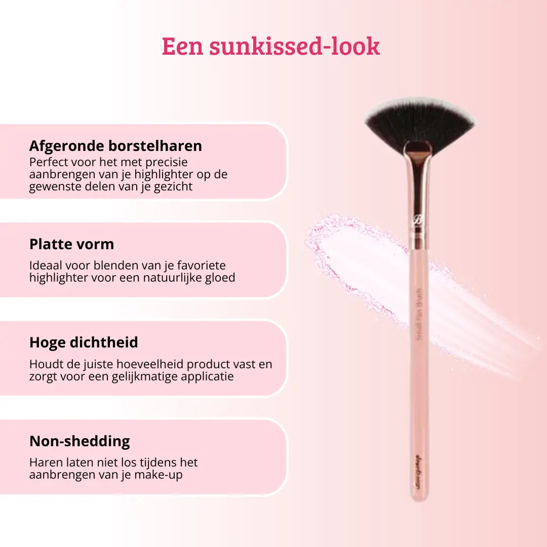 Ben je op zoek naar een kwast waarmee je je highlighter kunt aanbrengen? Bestel dan nu de Boozyshop Pink & Rose Gold Small Fan Brush!