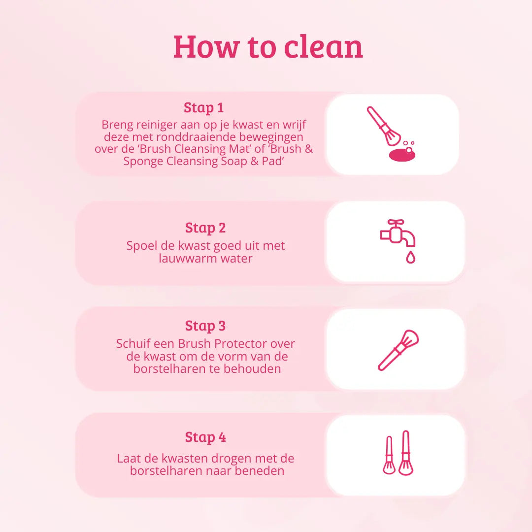 Het schoonmaken van je make-up kwasten is belangrijk om je huid gezond te houden en de levensduur van je kwasten te verlengen. Wij raden daarom aan om je make-up kwasten regelmatig, minstens één keer per week, grondig schoon te maken. Hiermee voorkom je dat bacteriën zich gaan ophopen die je huid kunnen verontreinigen.