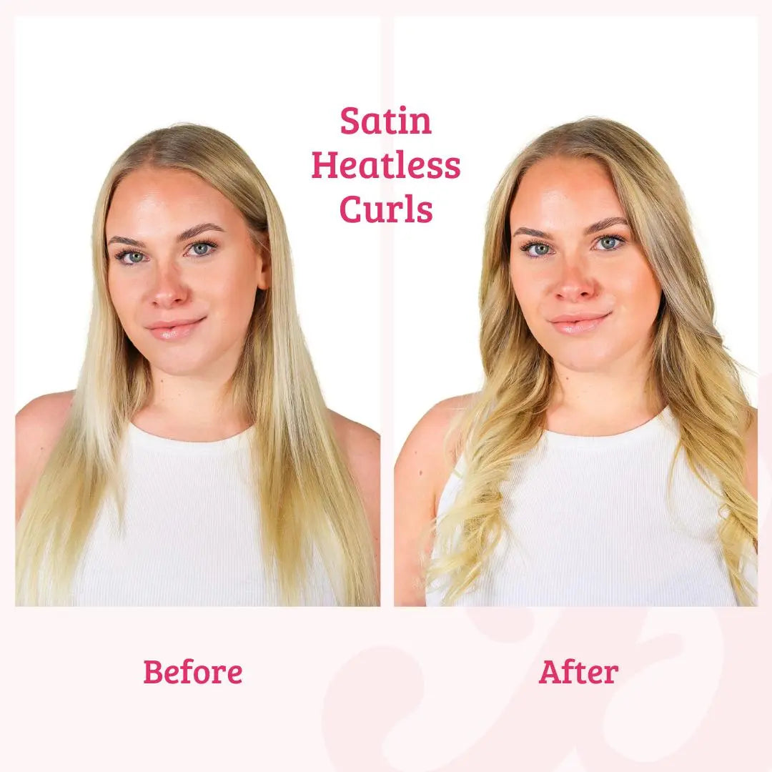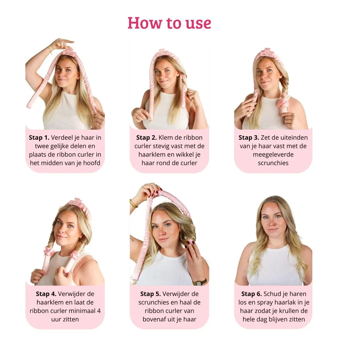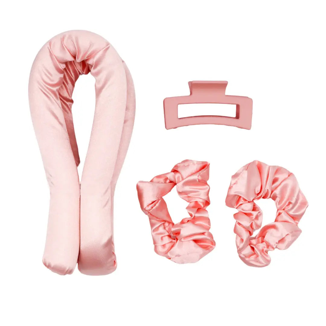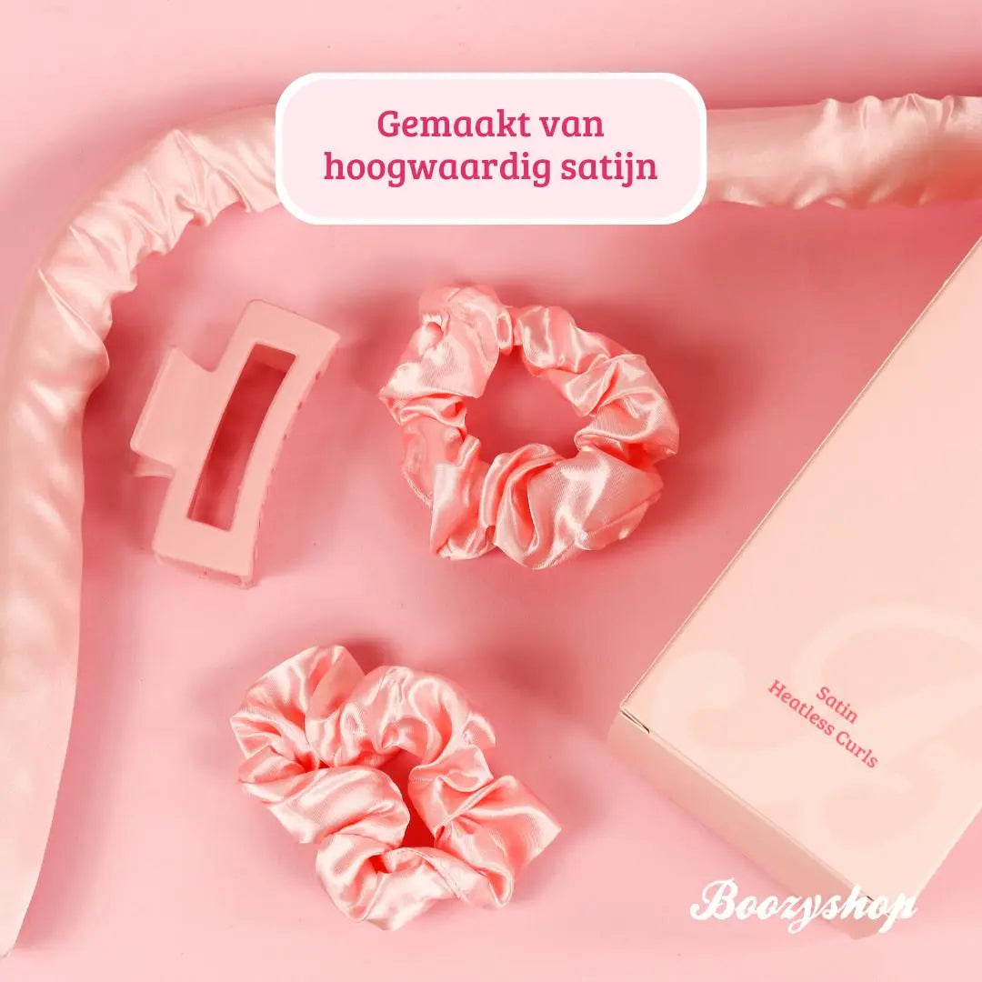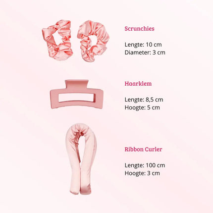 In de set vind je alles wat je nodig hebt: een zachte ribbon curler, twee satijnen scrunchies en een stijlvolle roze haarklem. De ribbon en scrunchies zijn gemaakt van luxe satijn dat lief is voor je haar, pluis voorkomt en de natuurlijke glans versterkt. De ribbon is lekker flexibel en zacht, waardoor je er comfortabel mee slaapt. Dus: inrollen voor het slapengaan, lekker dromen en wakker worden met volumineuze, glanzende krullen – zonder moeite én zonder schade.