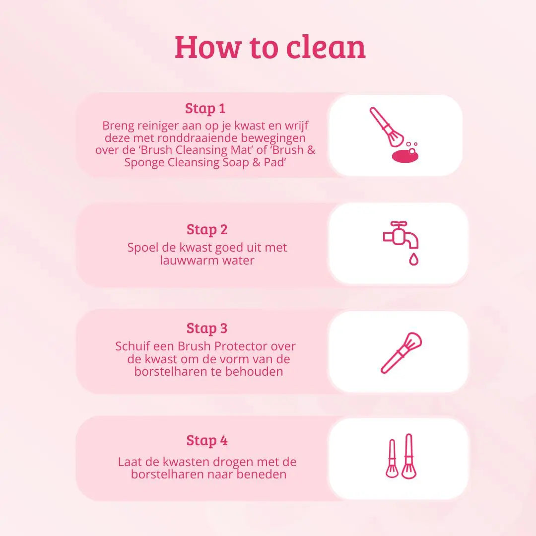 Het schoonmaken van je make-up kwasten is belangrijk om je huid gezond te houden en de levensduur van je kwasten te verlengen. Wij raden daarom aan om je make-up kwasten regelmatig, minstens één keer per week, grondig schoon te maken. Hiermee voorkom je dat bacteriën zich gaan ophopen die je huid kunnen verontreinigen.