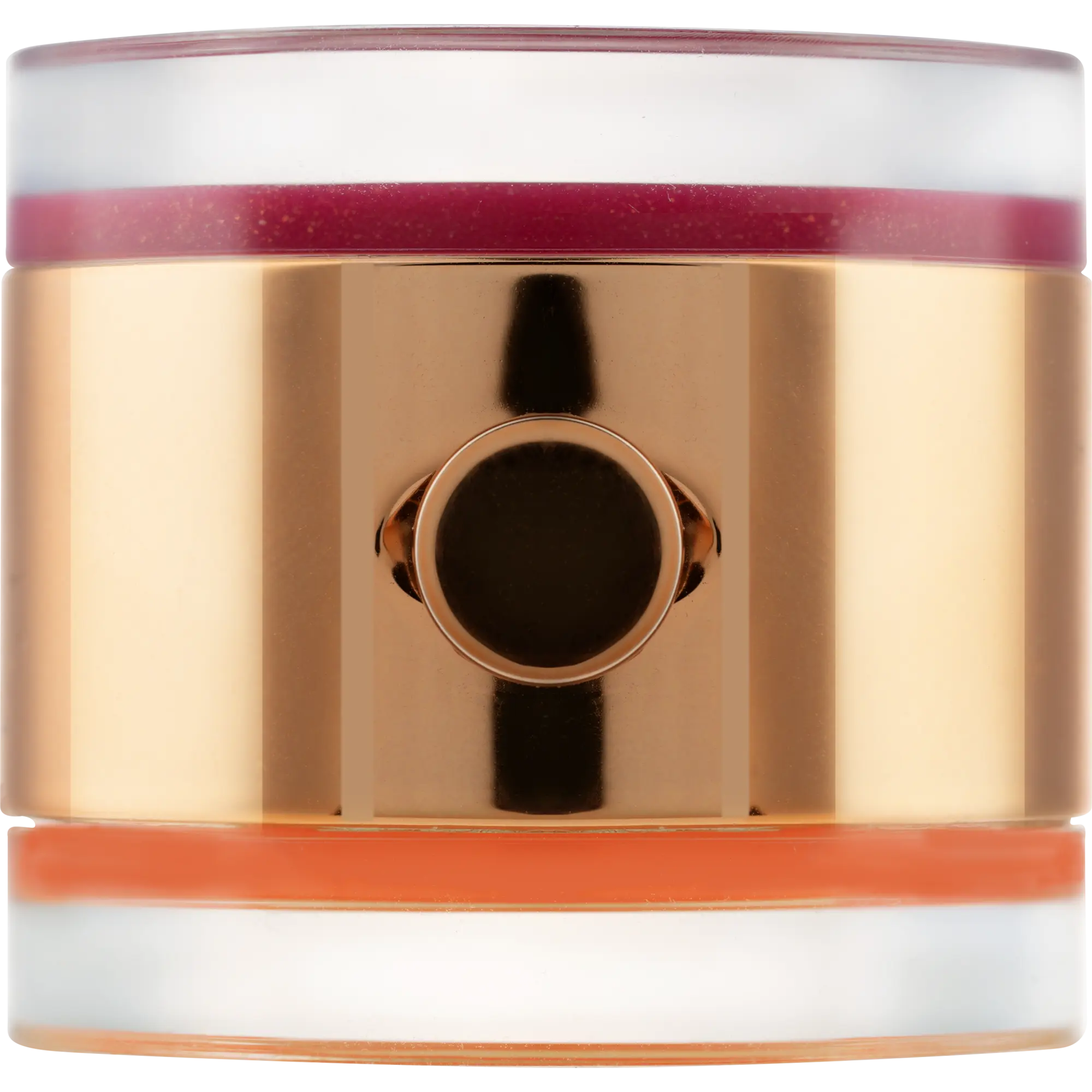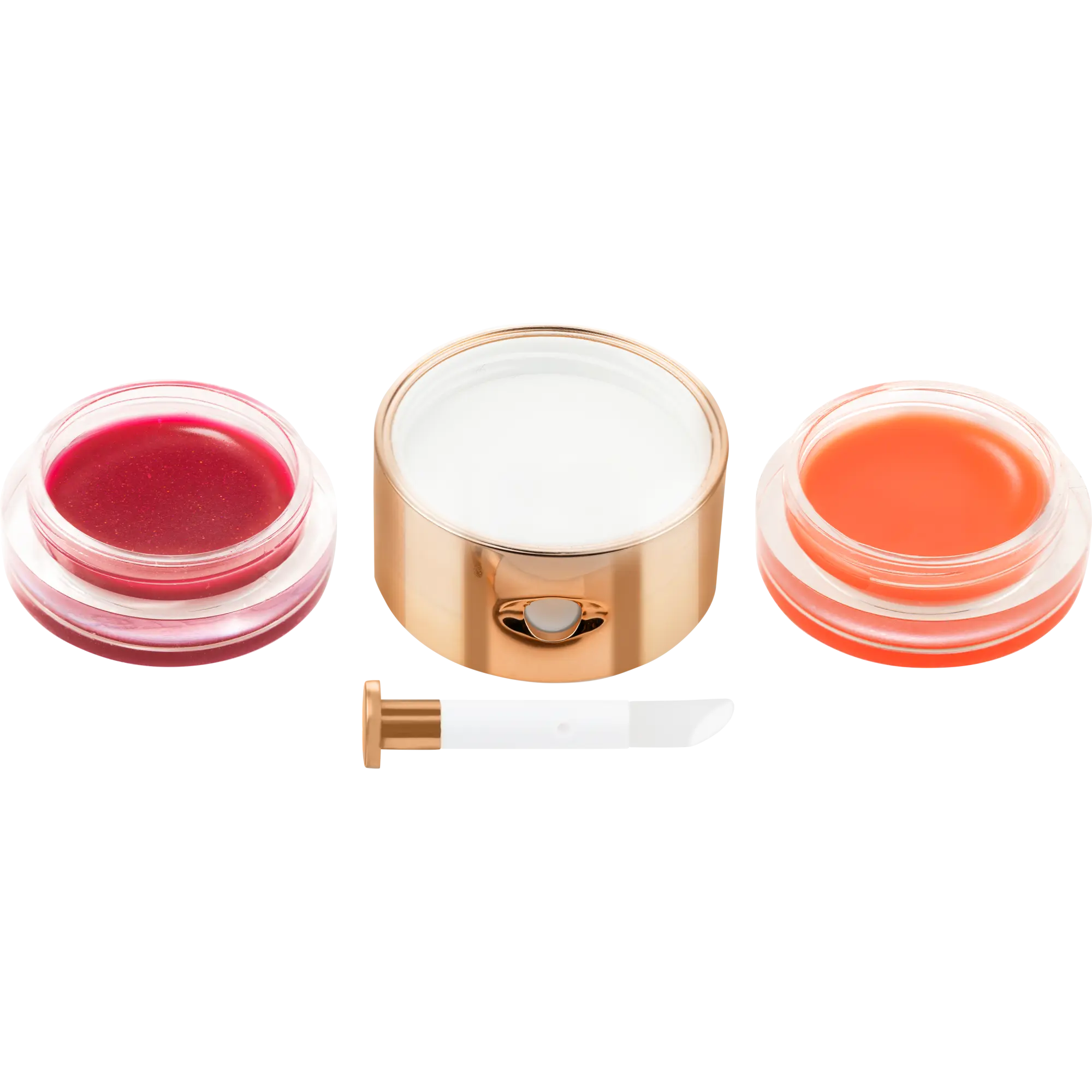 In het bovenste vakje vind je een roze balm met shimmer die je lippen meteen een juicy glow geeft dankzij hyaluronic acid. In het onderste vakje zit een oranje, olie-achtige formule die je lippen 's nachts kalmeert en voedt. En de applicator? Die zit handig verstopt in het midden van de verpakking. Superhandig voor on-the-go care!