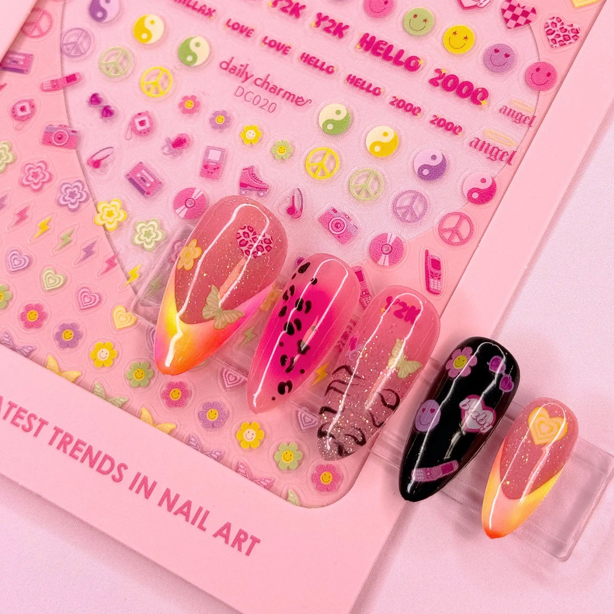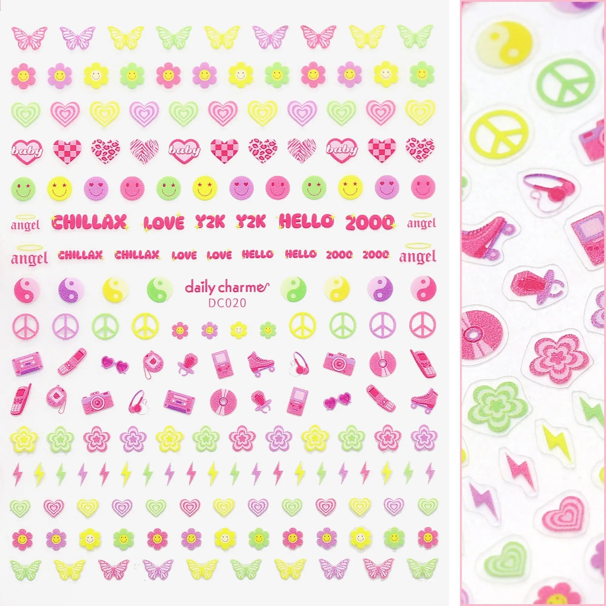 De Daily Charme Chic Nail Art Sticker Y2K Forever is een echte blast from the past die je nagels een vrolijke 2000s vibe geeft. Denk aan smiley faces flip phones rolschaatsen hartjes bloemetjes en peace tekens in de leukste candy kleuren. Perfect voor een zomerse look een festivaldag of gewoon als je zin hebt in een beetje nostalgie op je nagels.