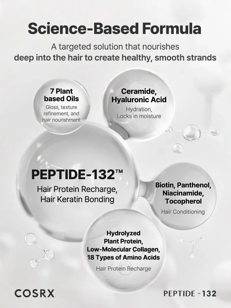 Aqua/Water, Glycerin, Dimethicone, Cetyl Ethylhexanoate, Isopentyldiol, Cetyl Alcohol, Stearyl Alcohol, Behentrimonium Chloride, Coco-Caprylate/Caprate, Stearamidopropyl Dimethylamine, Sorbitol, Dipropylene Glycol, Dimethiconol, Hydroxypropyl Starch Phosphate, Amodimethicone, Lactic Acid, Maltitol, Fragrance/Parfum, Caprylyl Glycol, Trideceth-10, Sodium Gluconate, Ethylhexylglycerin, Anthemis Nobilis Flower Water, 1,2-Hexanediol, Propanediol, Argania Spinosa Kernel Oil, Olea Europaea (Olive) Fruit Oil, Camellia Japonica Seed Oil, Simmondsia Chinensis (Jojoba) Seed Oil, Oryza Sativa (Rice) Bran Oil, Vitis Vinifera (Grape) Seed Oil, Biotin, Tripeptide-132 HCl, Macadamia Ternifolia Seed Oil, Sodium Hyaluronate, Tocopherol, Laminaria Japonica Extract, Sodium Metaphosphate, Avena Sativa (Oat) Peptide, Arginine, Serine, Glutamic Acid, Threonine, Leucine, Proline, Aspartic Acid, Isoleucine, Glycine, Soluble Collagen, Hydrolyzed Hyaluronic Acid, Phenylalanine, Alanine, Tyrosine, Lysine, Sodium Hyaluronate Crosspolymer, Histidine, Hyaluronic Acid, Caffeine, Panthenol, Niacinamide, Hydrogenated Lecithin, Butylene Glycol, Cetearyl Alcohol, Valine, Sodium Acetylated Hyaluronate, Stearic Acid, Methionine, Cystine, Tryptophan, Ceramide NP, Hydrolyzed Vegetable Protein, Ceramide NS, Phytosphingosine, Cholesterol, Ceramide AP, Ceramide AS, Ceramide EOP.