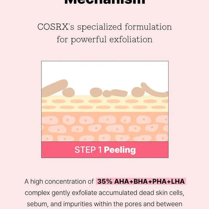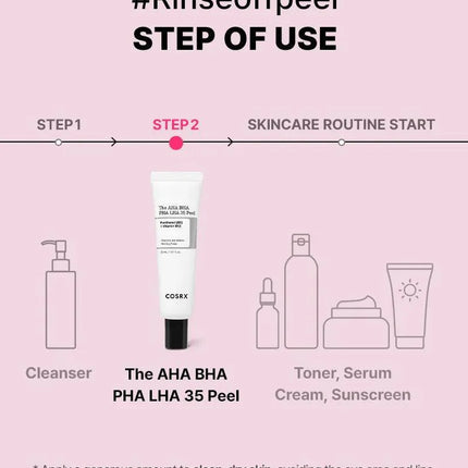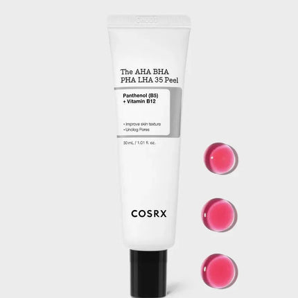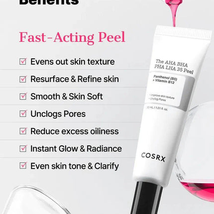 De COSRX The AHA BHA PHA LHA 35 Peel is jouw ultieme glow-up in slechts tien minuten. Deze krachtige peeling met vier soorten zuren, AHA, BHA, PHA en LHA, zorgt voor een directe huidvernieuwing en een stralend resultaat. Speciaal ontwikkeld voor de ervaren skincare lover die bekend is met intensieve exfoliatie.