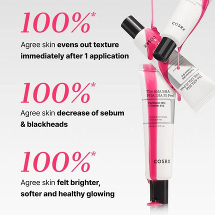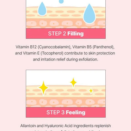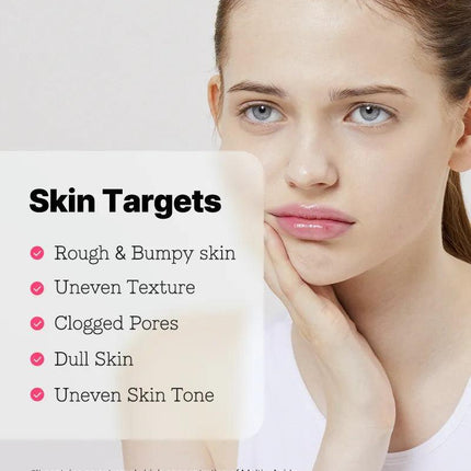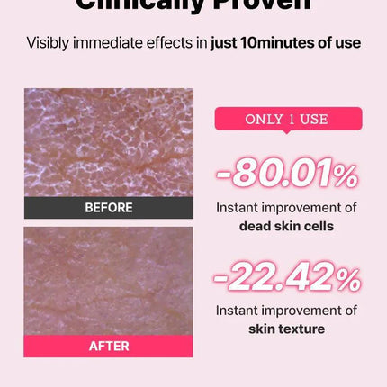 De formule pakt doffe teint, ruwe huidstructuur en verstopte poriën in één keer aan. Terwijl AHA’s dode huidcellen aan de oppervlakte verwijderen, dringen BHA’s dieper in de poriën om onzuiverheden los te maken. PHA en LHA zorgen voor milde, kalmerende exfoliatie zonder de huid uit te drogen. De gelachtige textuur smeert makkelijk uit en heeft een subtiel roze kleur dankzij vitamine B12, die ook helpt om de huid te kalmeren.