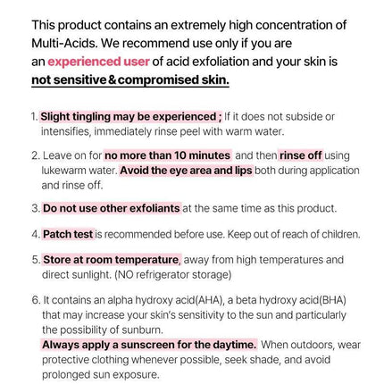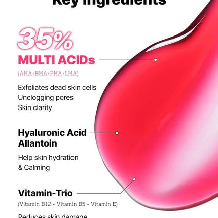 Water, Glycolic Acid, Lactic Acid, Potassium Hydroxide, Gluconolactone, Mandelic Acid, Dipropylene Glycol, Panthenol, Salicylic Acid(2%), Methylpropanediol, 1,2-Hexanediol, Octyldodeceth-16, Citric Acid, Hydroxyethylcellulose, Pentylene Glycol, Sodium Polyacryloyldimethyl Taurate, Cyanocobalamin, Polyacrylate Crosspolymer-6, Hydroxypropyl Starch Phosphate, Ethylhexylglycerin, Capryloyl Salicylic Acid, Polysorbate 60, Disodium Phosphate, Sodium Phosphate, Tocopherol, Allantoin, Hydrolyzed Hyaluronic Acid.