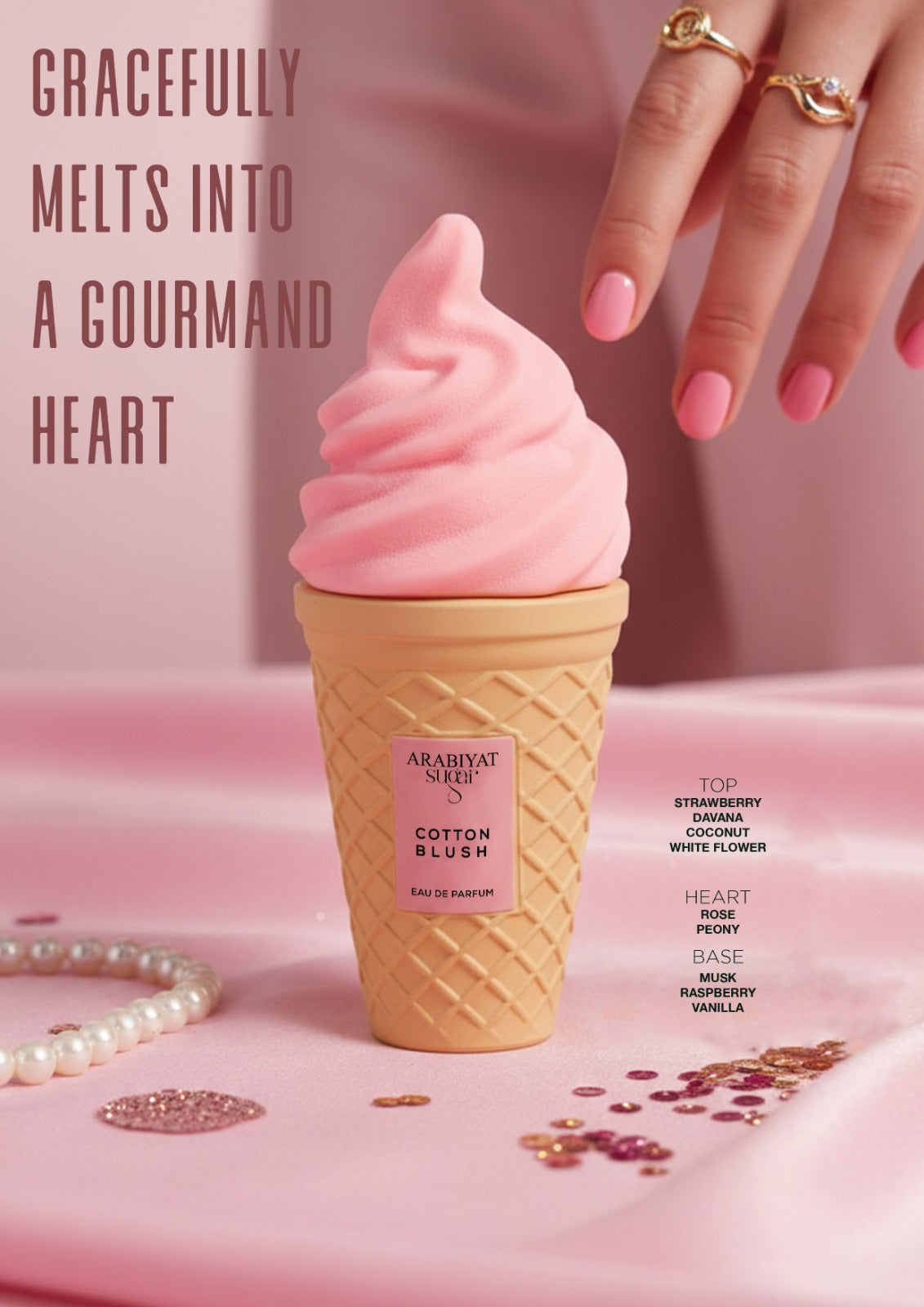 Het Arabiyat Sugar Cotton Blush Eau De Parfum geïnspireerd op Yum Boujee Marshmallow is een zachte, poederige unisex geur die ruikt als frisgewassen katoen met een elegante twist. Deze verfijnde compositie combineert de zuiverheid van witte katoen met de subtiele zoetheid van rode bessen en romige vanille. Het resultaat? Een clean, luchtig en tegelijk sensueel parfum dat aanvoelt als een zachte omhelzing.