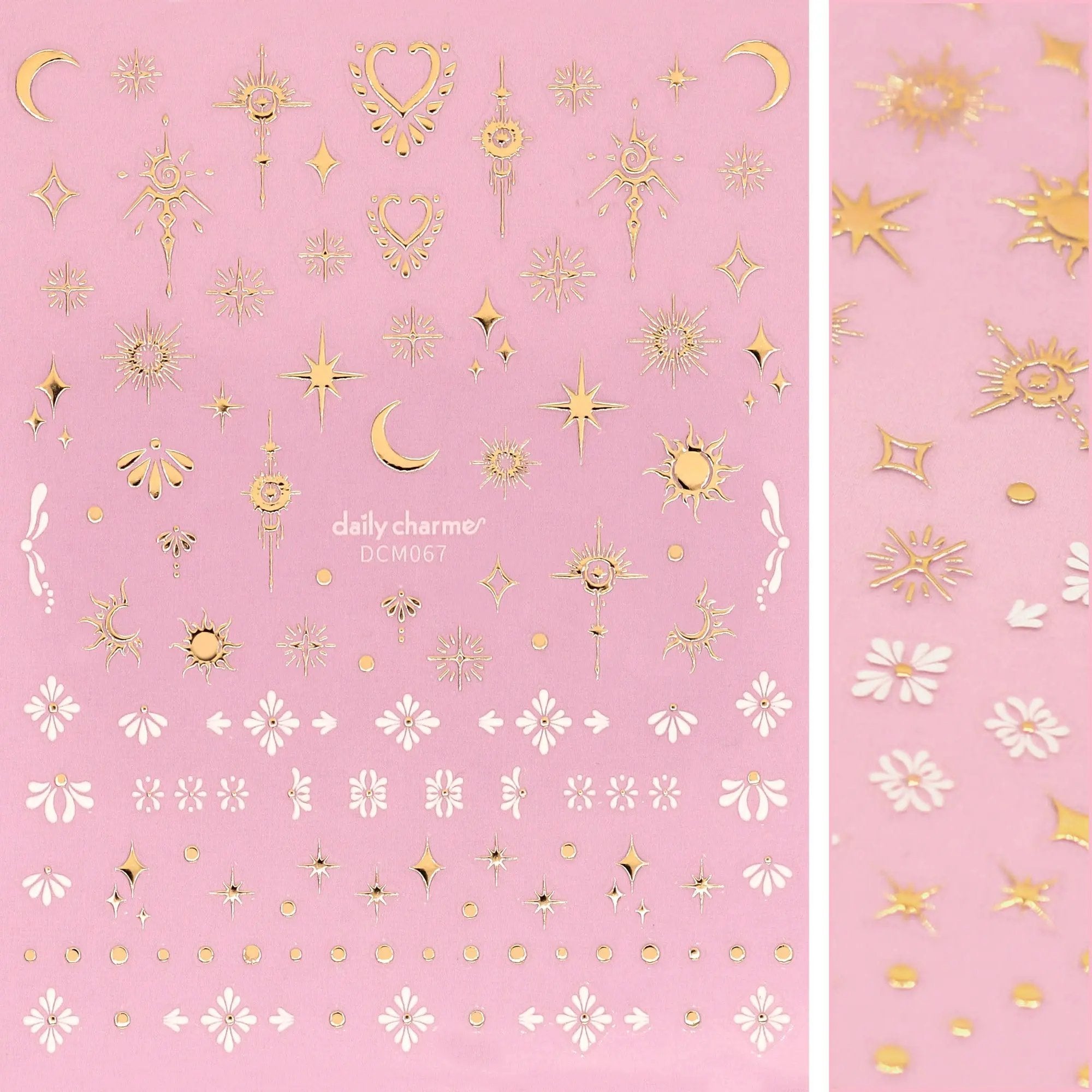 De Daily Charme 3D Embossed Nail Art Sticker Celestial Element brengt een magische touch naar je nagels met een mix van metallic gouden en matte witte designs. Deze sticker sheet zit vol met abstracte zon maan sterren sparkles dots tribal elementen en kleine bloemetjes.