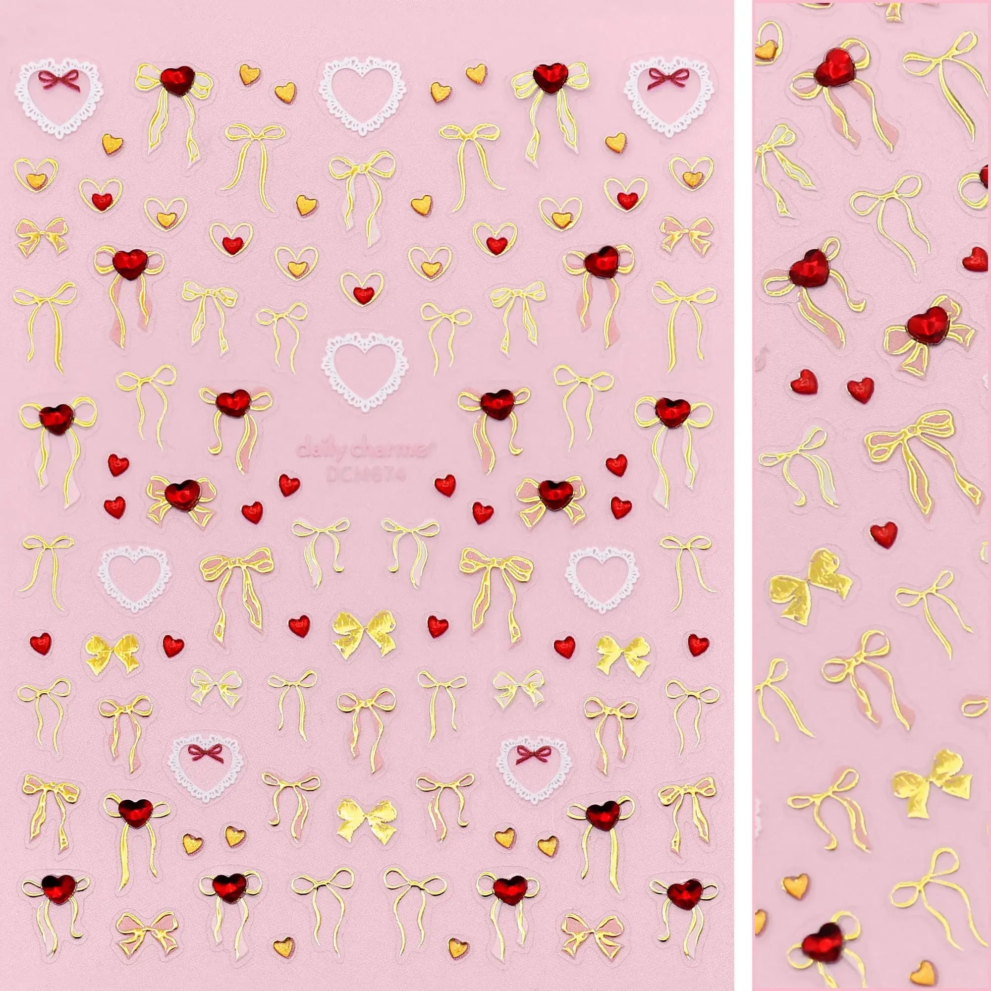 De Daily Charme Valentine Bejeweled Nail Art Sticker Lovely Fairy Bows is pure romantische magie op je nagels! Dit betoverende stickervel zit vol met sierlijke roze en gouden strikjes en fonkelende hartvormige robijnrode accenten: perfect voor een dreamy, coquette-inspired manicure. Of je nu Valentijnsdag viert of gewoon zin hebt in een sprookjesachtige look: met deze stickers geef je jouw nagels een elegant, speels en koninklijk accent.