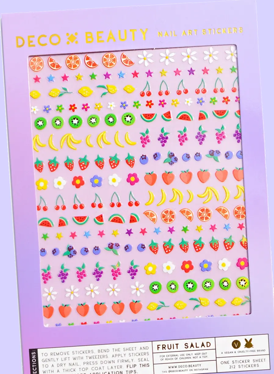 De Deco Beauty Nail Art Stickers Fruit Salad zijn een echte musthave voor iedere nail art lover. Deze tiny handgetekende fruit designs geven je manicure een frisse, speelse en zomerse vibe waar je meteen vrolijk van wordt.