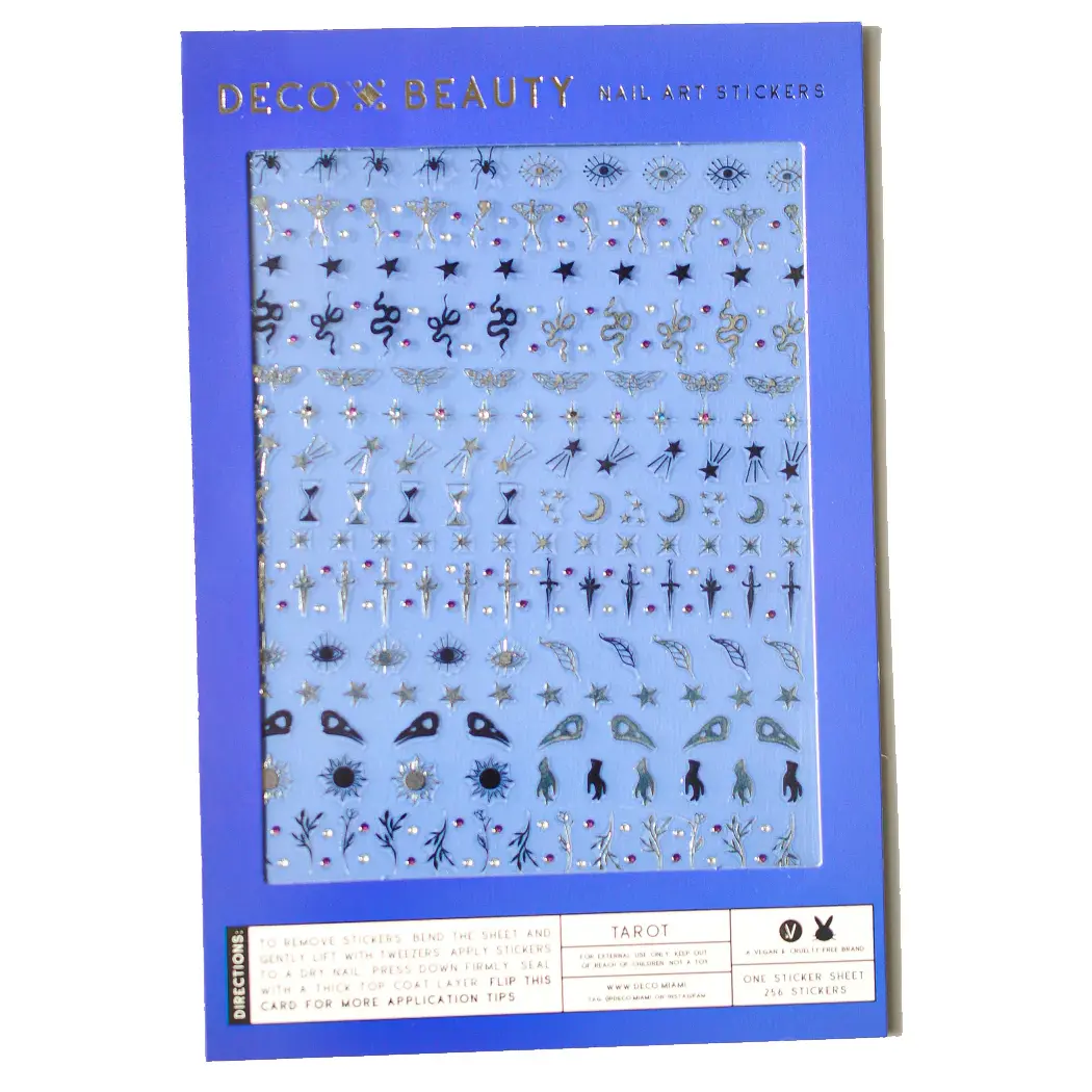 De Deco Beauty Nail Art Stickers Tarot geven jouw manicure instant celestial witchy vibes. Denk aan zilveren, mystieke designs geïnspireerd op tarot, sterren en kosmische details die je nagels een magische en mysterieuze uitstraling geven.