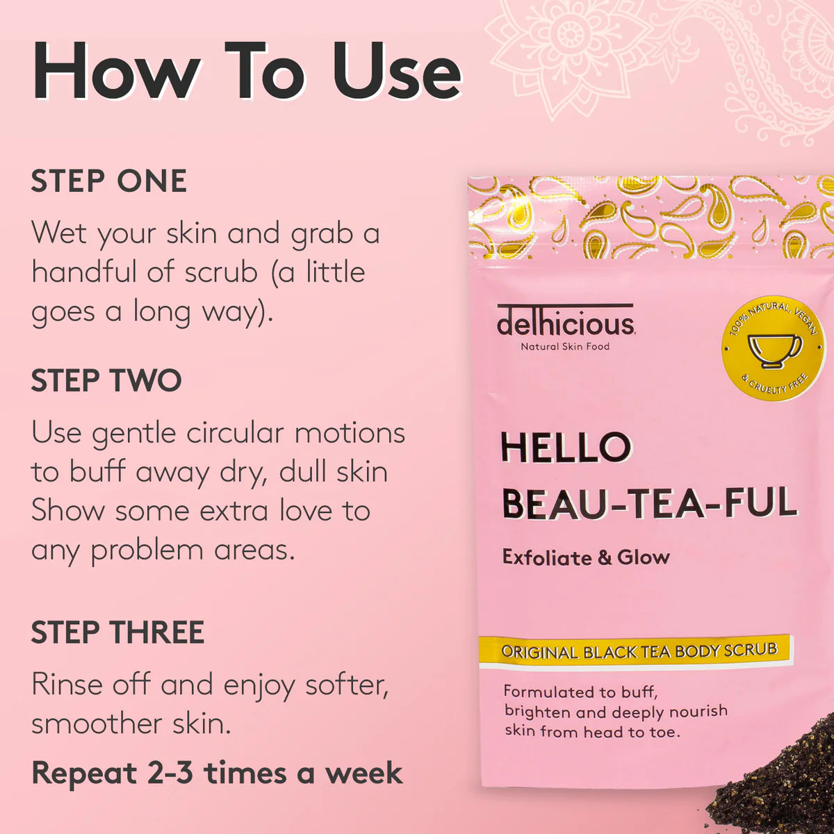 De Delhicious Original Black Tea Body Scrub is dé oplossing voor een droge, doffe huid én strawberry skin! Deze intensief exfoliërende bodyscrub zit boordevol cafeïne en antioxidanten uit Indiase Black Assam Tea, en verwijdert dode huidcellen op milde maar effectieve wijze. Al na één gebruik voelt je huid zachter, gladder en frisser aan.