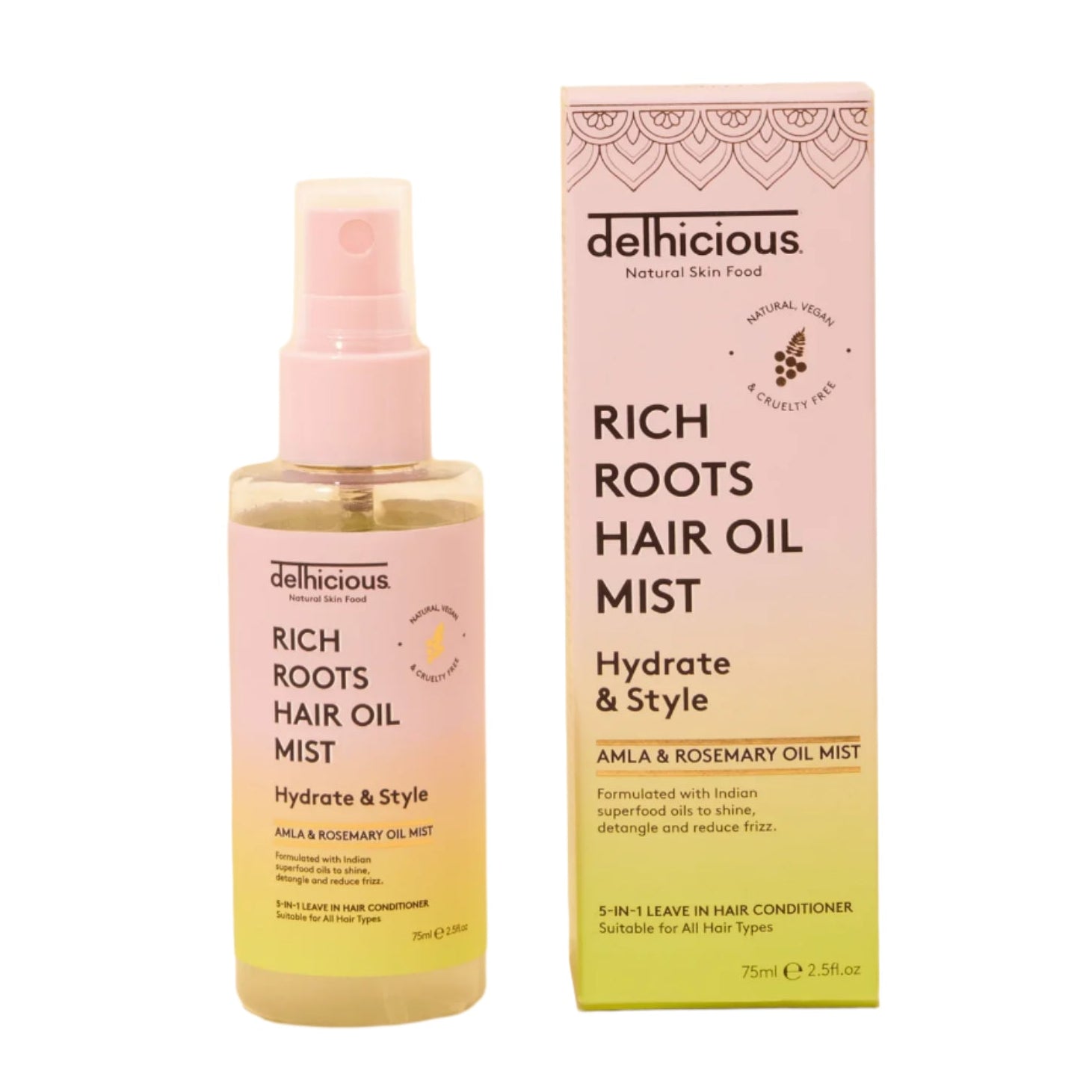 De Delhicious Rich Roots 5-in-1 Hair Oil Mist Leave In Conditioner is dé multitasker voor je haar! Deze lichtgewicht mist voedt, verzacht, ontwart, temt pluis en geeft een gezonde glans – allemaal in één spray. De unieke formule bevat een krachtige mix van rozenwater, Indiase Amla, rozemarijn, arganolie en Bhringraj die je lokken intens hydrateren en versterken.