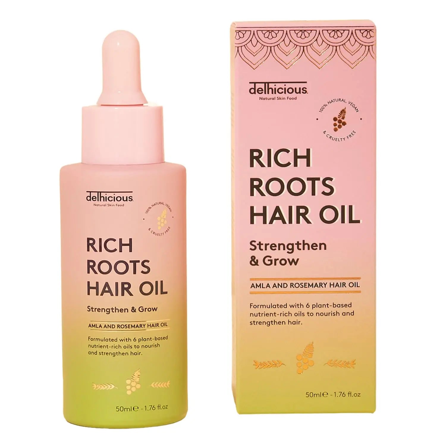 De Delhicious Rich Roots Hair & Scalp Oil Amla & Rosemary is een krachtige Ayurvedische haarolie die je wekelijkse haarverzorgingsroutine naar een hoger niveau tilt. Deze formule combineert zes plantaardige oliën die al eeuwenlang in de Indiase traditie worden gebruikt om het haar te versterken, diep te voeden en haargroei te stimuleren.