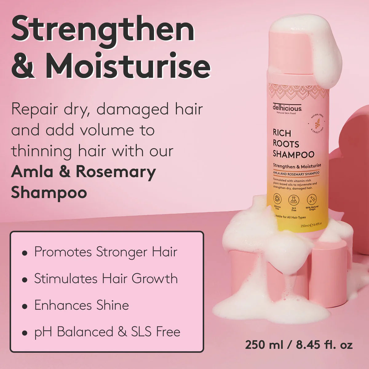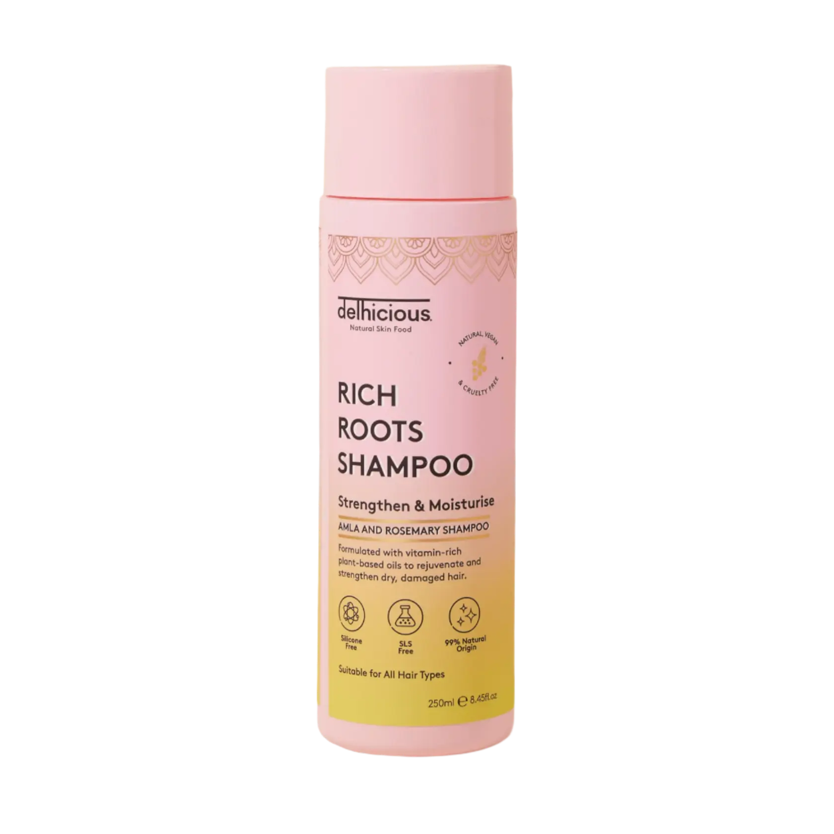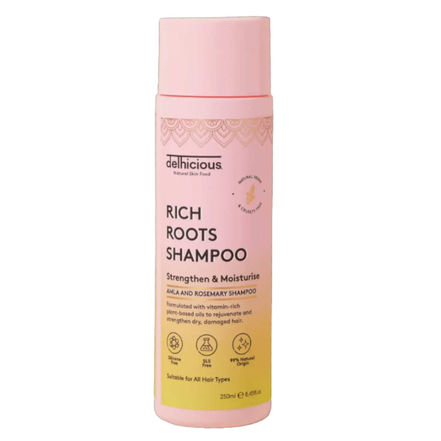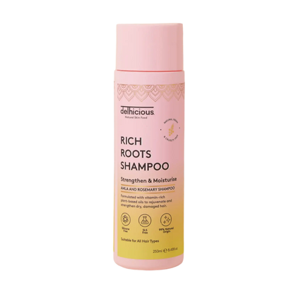 De Delhicious Rich Roots Strengthen & Moisturise Shampoo Amla & Rosemary is een ware gamechanger voor dof, droog en futloos haar. Deze milde shampoo is verrijkt met krachtige Indiase superfoods en kruiden zoals amla bes, shikakai en Indiase zeepnoten. Dankzij de voedende oliën van argan en rozemarijn wordt je haar intens gehydrateerd en versterkt vanaf de wortel tot in de punten.