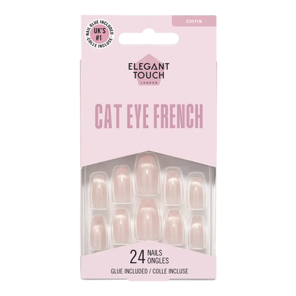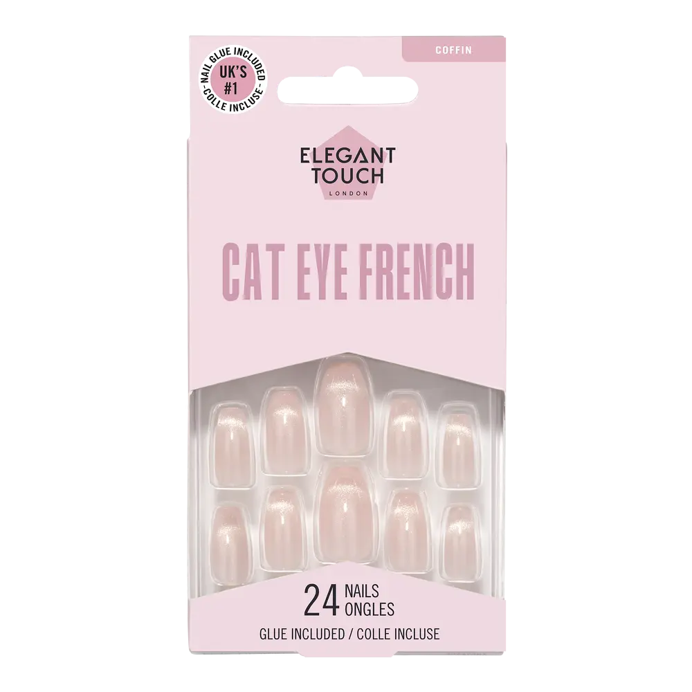 De Elegant Touch Cat Eye French Mirage nagels brengen de betoverende 'cat eye' trend naar je vingertoppen. Dankzij de mooie cat eye nail art creëren deze coffin-vormige nagels een dynamisch French tip-effect dat met het licht meebeweegt, waardoor je manicure vanuit elke hoek schittert.