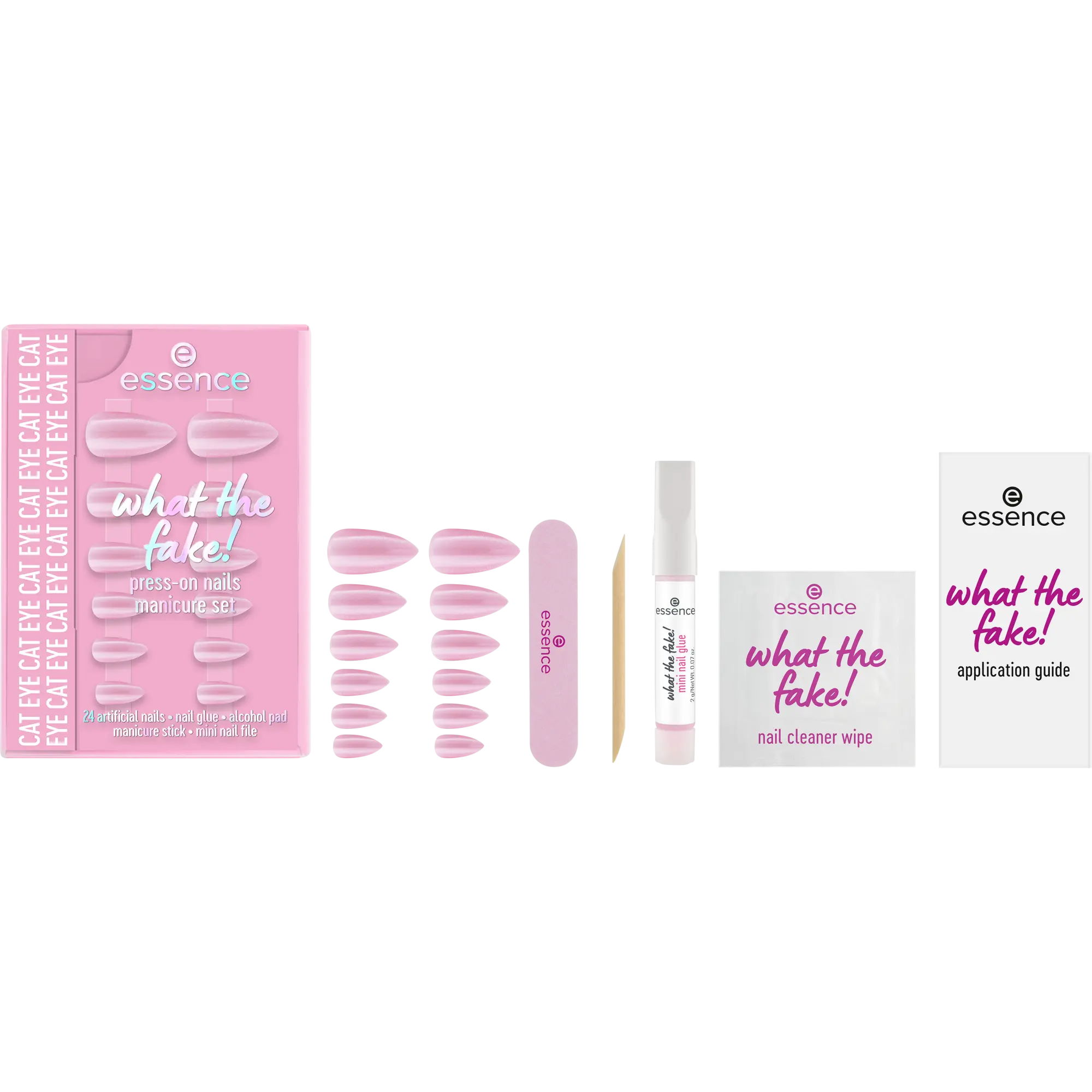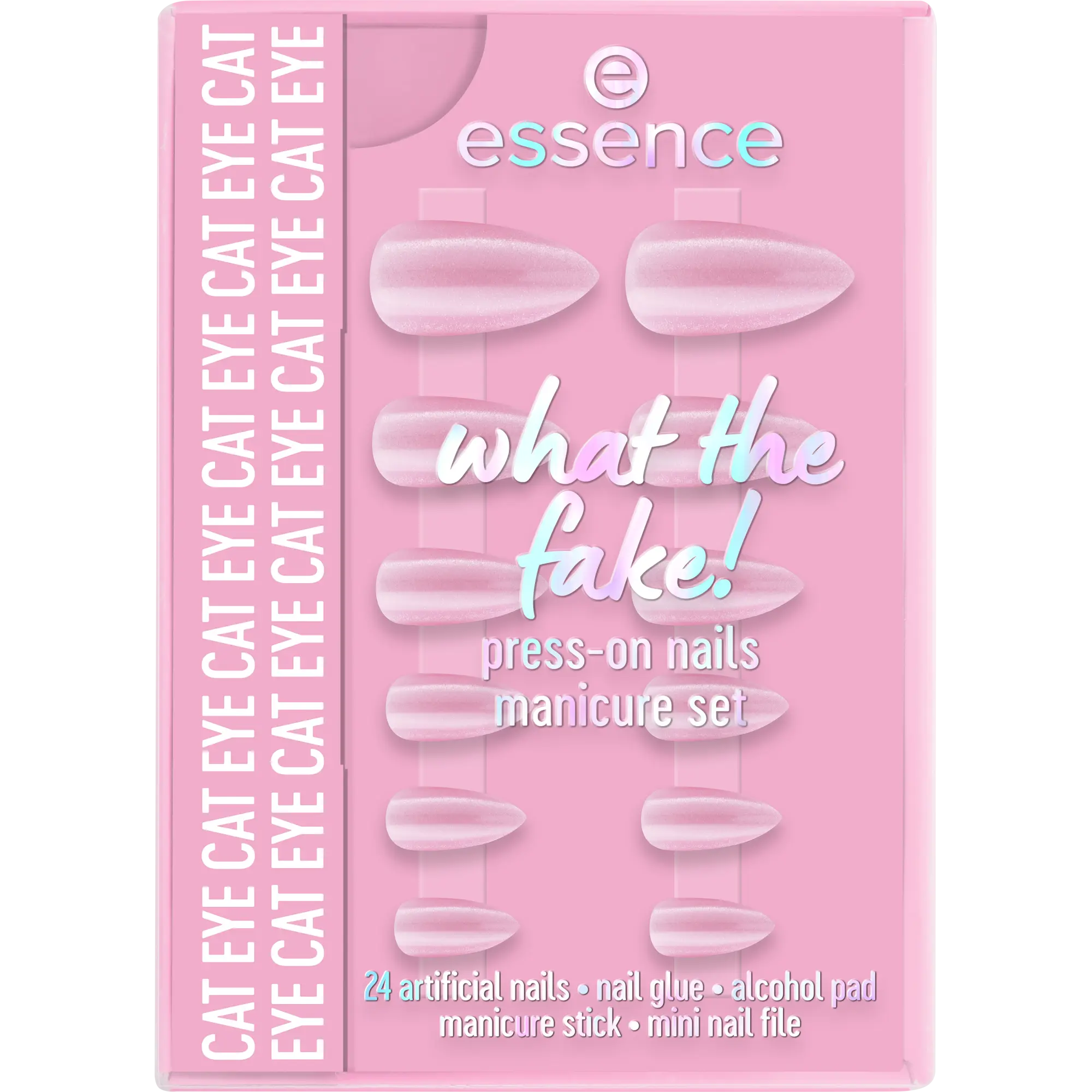 De Essence What The Fake! Press on Nails Manicure Set 02 Cat Eye geeft je in no time een salonwaardige manicure zonder gedoe. Deze ready to go nagels hebben een trendy glans en passen perfect bij elke look, van casual tot party proof. Dankzij de verschillende maten vind je altijd de perfecte match voor jouw nagels, en de handige set bevat alles wat je nodig hebt om meteen aan de slag te gaan.