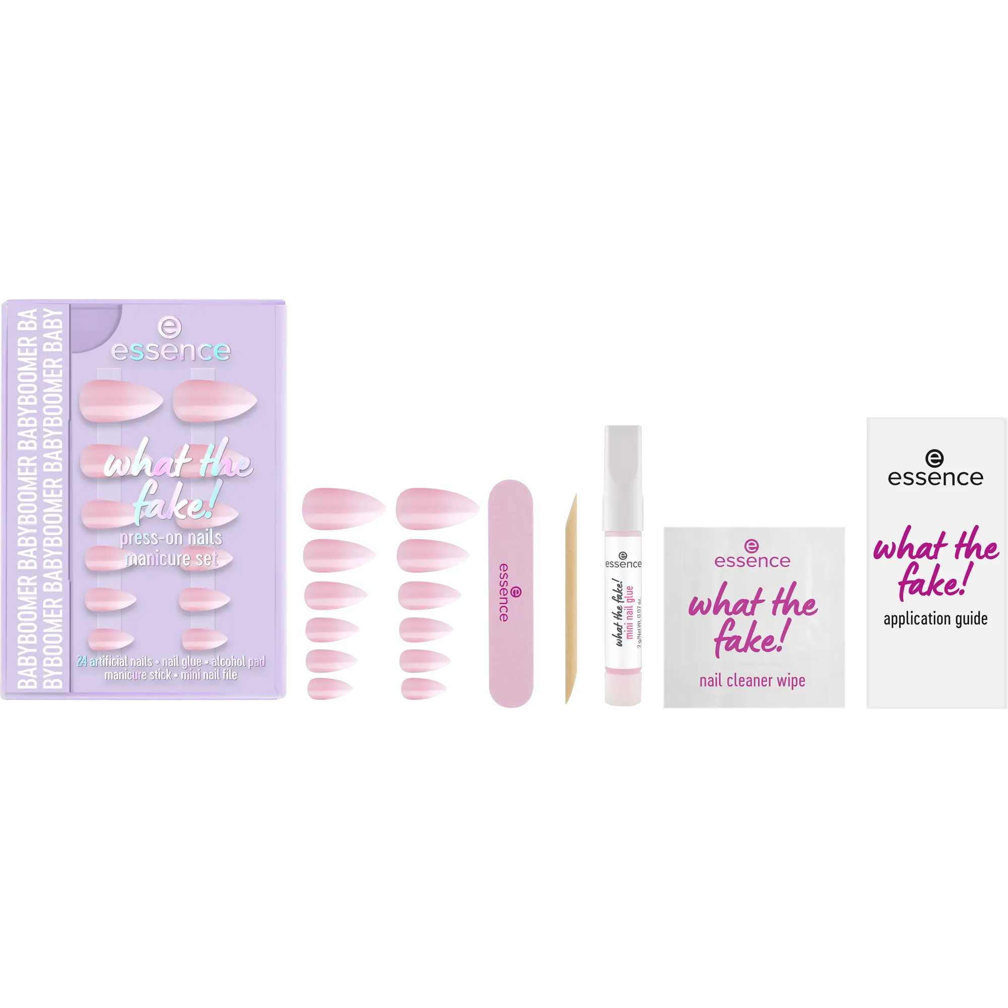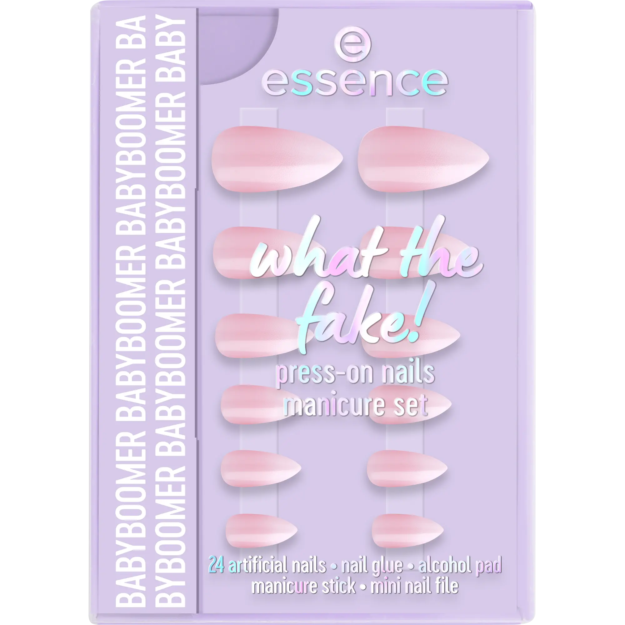 De Essence What The Fake! Press-on Nails Manicure Set 03 Babyboomer is jouw go to oplossing voor prachtige nagels in no time. Deze set bevat 24 press on nagels in 12 verschillende maten, zodat je altijd de perfecte fit vindt voor jouw nagelvorm. De klassieke babyboom look met een zachte roze basiskleur en elegante almond vorm geeft je een nette en verzorgde uitstraling zonder dat je naar de salon hoeft.