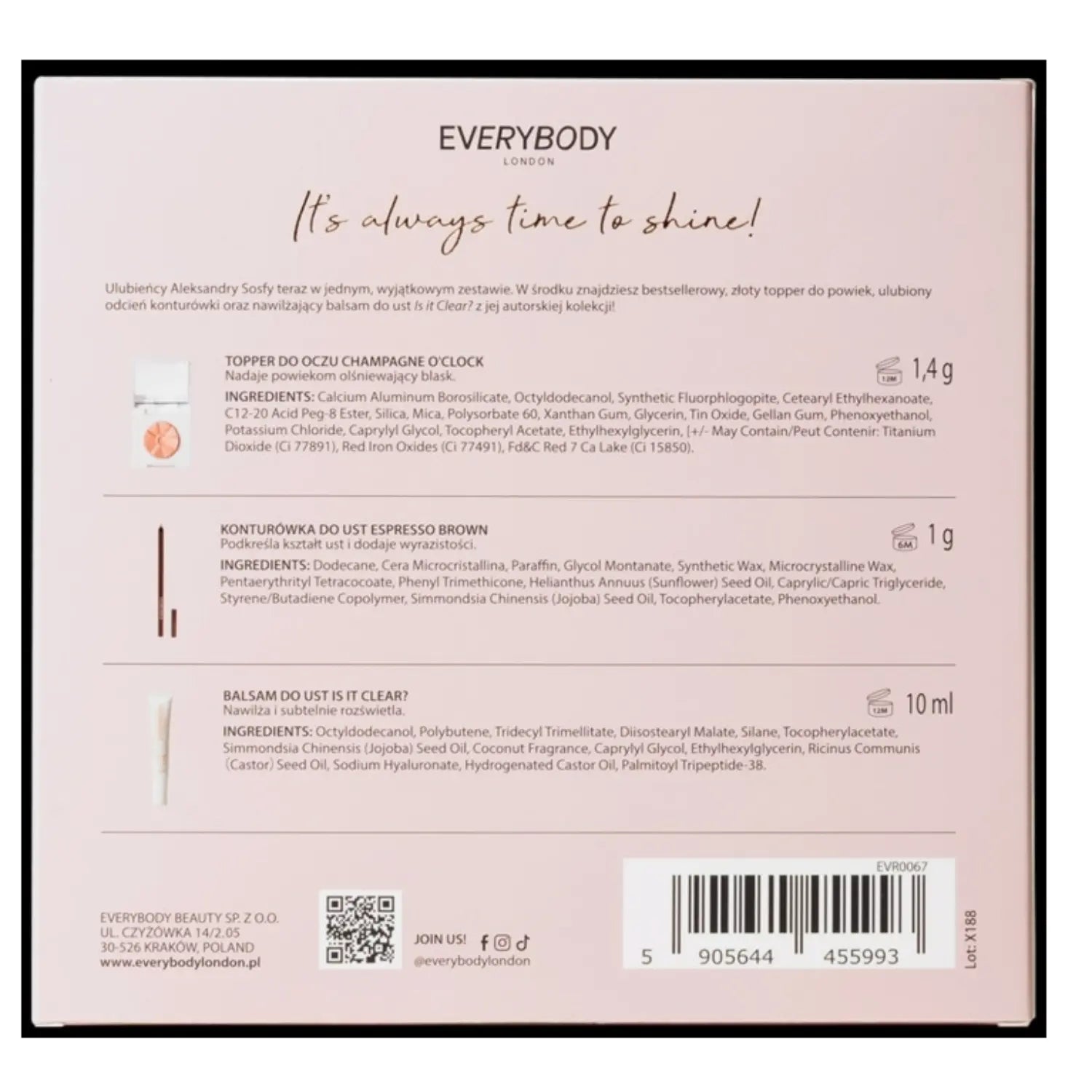 De Everybody London Champagne Chic Eye & Lip Set is jouw feestelijke must-have voor de ultieme glam look deze kerst! Deze elegante set bevat drie prachtige producten die samen zorgen voor een stralende finish: een glanzende oogschaduw in chique champagnekleur, een transparante lip balm voor juicy lips én een lip liner in een diepe espresso brown voor perfecte definitie.
