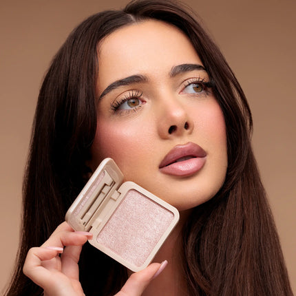 De roze tint is perfect voor het accentueren van je jukbeenderen, neusbrug, cupidoboog of zelfs je sleutelbeenderen. Ook als oogschaduw geeft deze highlighter een zachte shimmer. De luxe verpakking met ingebouwd spiegeltje maakt ‘m ideaal voor onderweg, zo ben je altijd klaar om te stralen.
