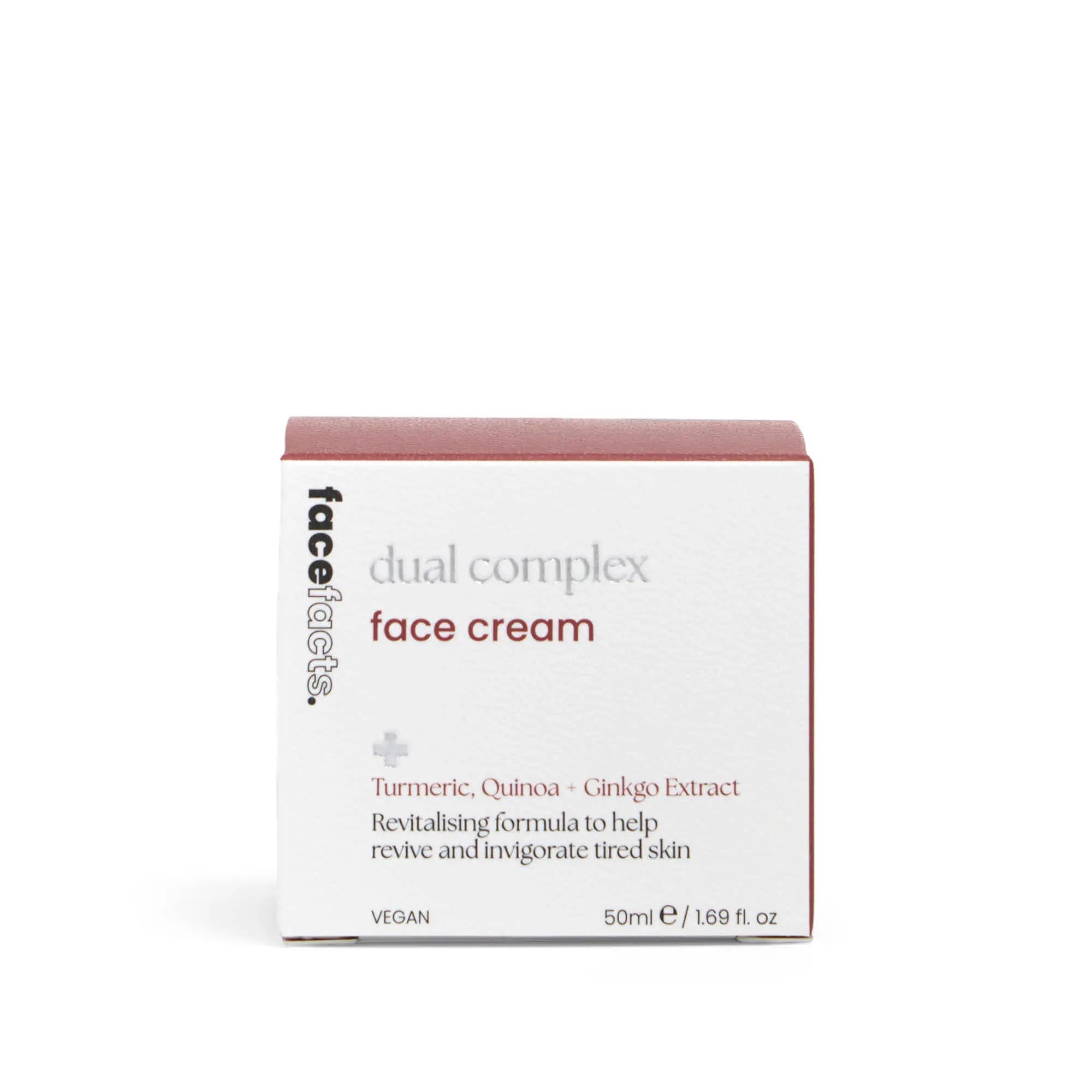De Face Facts Dual Complex Face Cream is precies wat je huid nodig heeft om weer tot leven te komen. Deze voedende dagcrème zit boordevol krachtige botanische extracten zoals kurkuma, quinoa en ginkgo, die samenwerken om vermoeide huid te herstellen, te verzachten en een natuurlijke glow terug te brengen.
