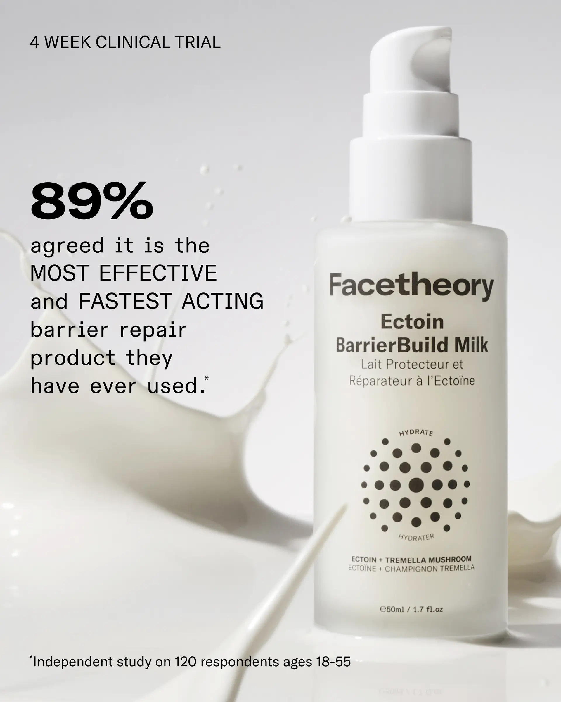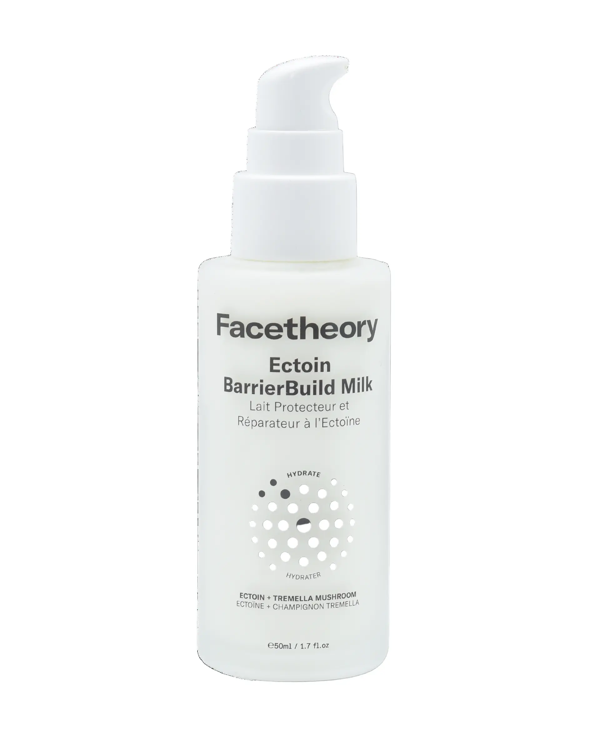 De Facetheory Ectoin BarrierBuild Milk is een ultralichte, zijdezachte milk die moeiteloos in je huid smelt, maar ondertussen keihard werkt om je huidbarrière te herstellen. Klinisch bewezen: al binnen 4 uur wordt je barrière versterkt, ideaal voor wie kampt met roodheid, droogte of overgevoeligheid.