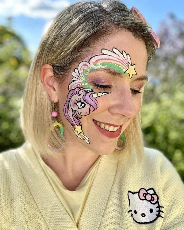 De schmink wordt geactiveerd met water, glijdt soepel over de huid en droogt snel op zonder te vlekken. Dankzij de hoge pigmentatie zijn de kleuren super helder, zelfs in één laag. Ideaal voor alles van regenboogdesigns, unicorns en bloemenkransen tot cute animals en sprookjesachtige looks. En ja hoor, ook geschikt voor gevoelige huidjes!