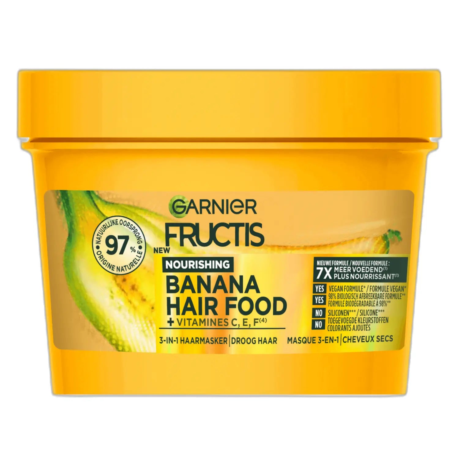 Het Garnier Fructis Hair Food Banana 3-in-1 Hair Mask is jouw ultieme redder voor droog haar. Deze romige, zachte formule met bananenextract voedt je lokken intens zonder ze te verzwaren. De vernieuwde formule is geboost met vitamine C, E en F en verrijkt met karitéboter voor extra verzorging.