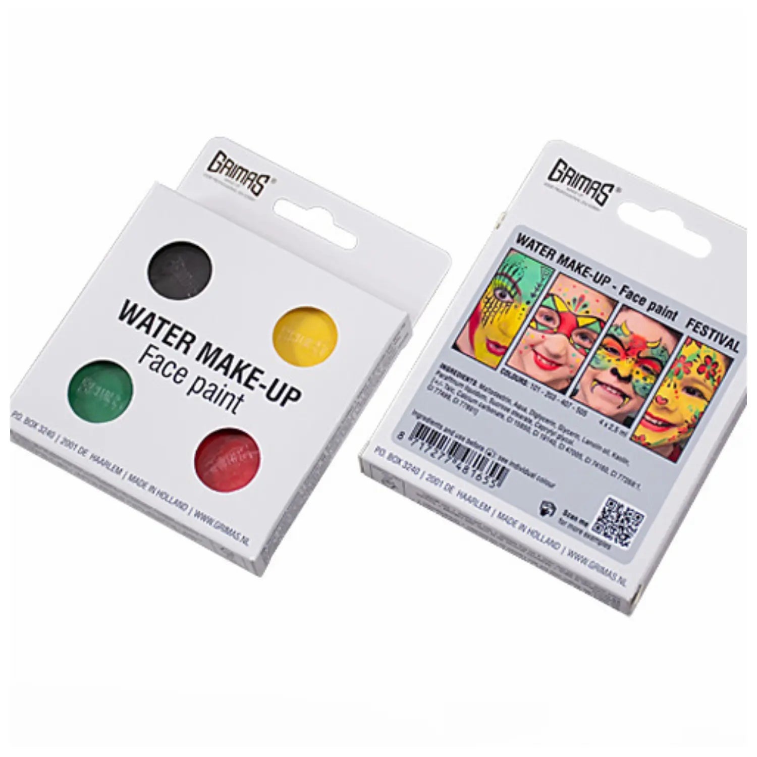 De Grimas Water Make-up 4xA1 Festival Set is een compacte, kleurrijke must-have voor iedereen die dol is op creatieve en vrolijke festival looks! Deze set bevat 4 levendige kleuren water make-up waarmee je de leukste gezichts- en lichaamsontwerpen maakt: van regenboogstrepen tot funky vormen en glitteraccenten (combineer met glitter voor extra sparkle!).
