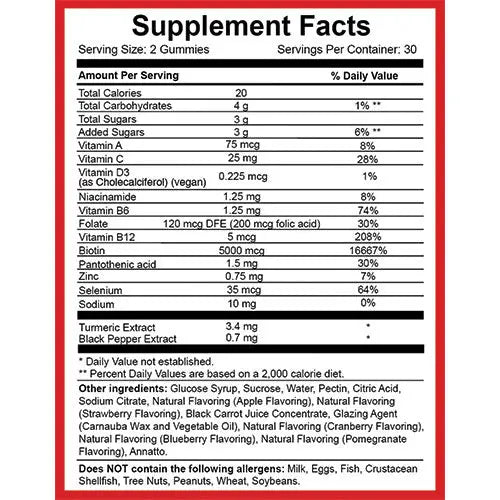Vitamin A, Vitamin C, Vitamin D, Niacinamide, Vitamin B6, Folate, Vitamin B12, Biotin, Panthothenic Acid, Zinc, Selenium, Sodium, Turmeric Extract, Black Pepper Extract, Glucose Syrup, Sucrose,water, Pectin, Citric Acid, Sodium Citrate, Natural Falvouring (Apply Flavouring), Natural Flavouring (Strawberry Flavouring), Black Carrot Juice Concentrate, Glazing Agent (Carnauba Wax And Vegetable Oil), Sodium Hexametaphosphate, Natural Flavouring (Cranberry Flavouring), Natural Flavouring (Blueberry Flavouring), Natural Flavouring (Pomegranate Flavouring), Annatto.