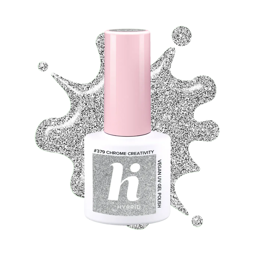De Hi Hybrid 379 Chrome Creativity UV Gel Polish is een zilveren showstopper met een intense mirror finish. Deze futuristische tint vangt het licht vanuit elke hoek en is allesbehalve subtiel. Perfect voor de It Girl die haar eigen rules schrijft en van elke look een kunstwerk maakt.