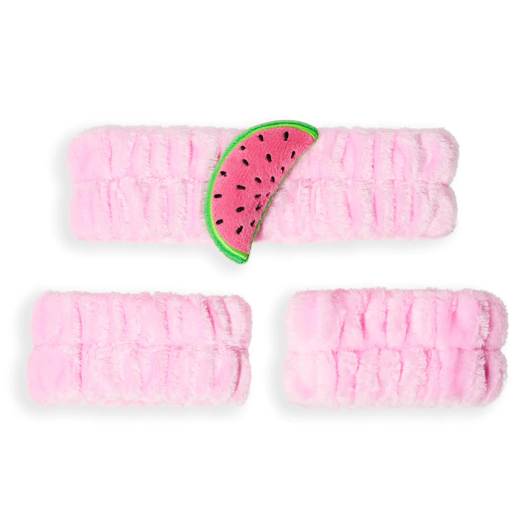 De I Heart Revolution Fruity Face Headband And Anti Drip Wristbands set maakt jouw skincare routine zoveel leuker én makkelijker! Deze superzachte set bestaat uit een fluffy roze hoofdband met schattige watermeloen-details en bijpassende anti-drip polsbandjes die water tegenhouden tijdens het reinigen of aanbrengen van maskers.