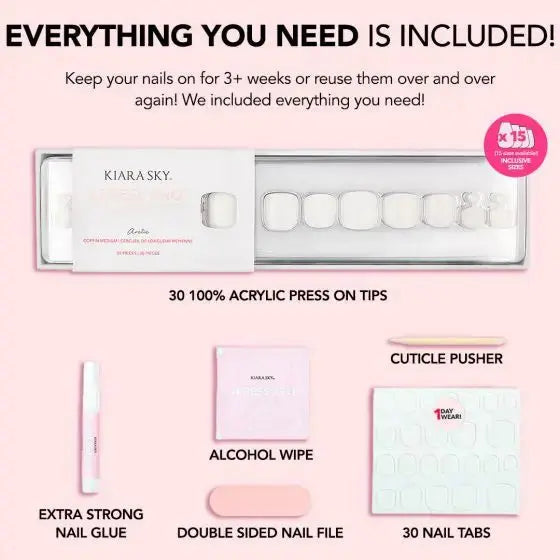Gemaakt van 100% acryl en met een salonwaardige finish zorgen deze press-ons voor een tijdloze en elegante pedicure in slechts een paar minuten. Je kunt kiezen uit drie applicatiemethoden: plak tabs voor een weekend-look, nagellijm voor tot 2 weken wear of acryl voor langdurige perfectie tot 3+ weken.