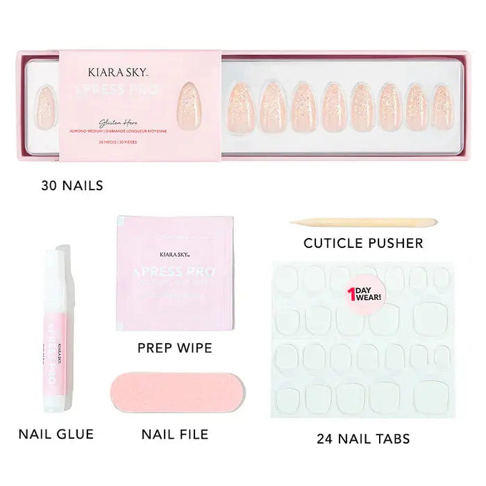 De Kiara Sky xPress Pro Press-on Nails Glisten Here zijn jouw go-to als je op zoek bent naar die perfecte glitter ombre manicure die gewoon niet genegeerd kan worden. Deze set combineert een elegante beige tint die bij elke huidskleur past met een sprankelende gouden glittertip voor een instant wauw-effect. Of je ze nu draagt voor een feestje, een brunch of gewoon omdat je zin hebt in fabulous nails, deze set laat je shinen!