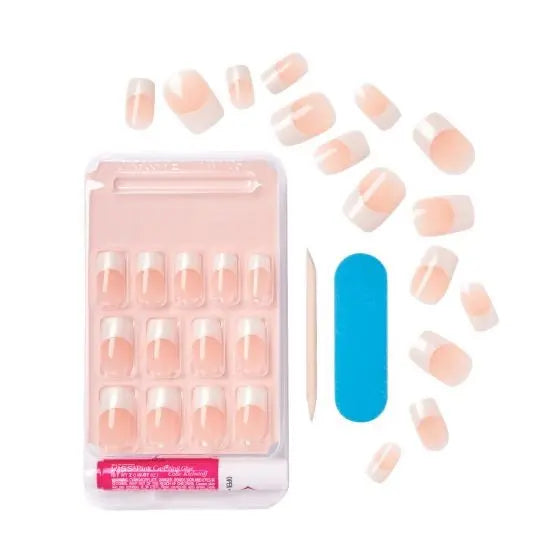 De Kiss Everlasting French Nail Kit Wedding Gown geeft je de perfecte french manicure in een handomdraai thuis! Geen gedoe meer met stickers en 3 verschillende lakjes, simpelweg plakken met de meegeleverde lijm en je nagels zien eruit alsof je net van de manicure komt.