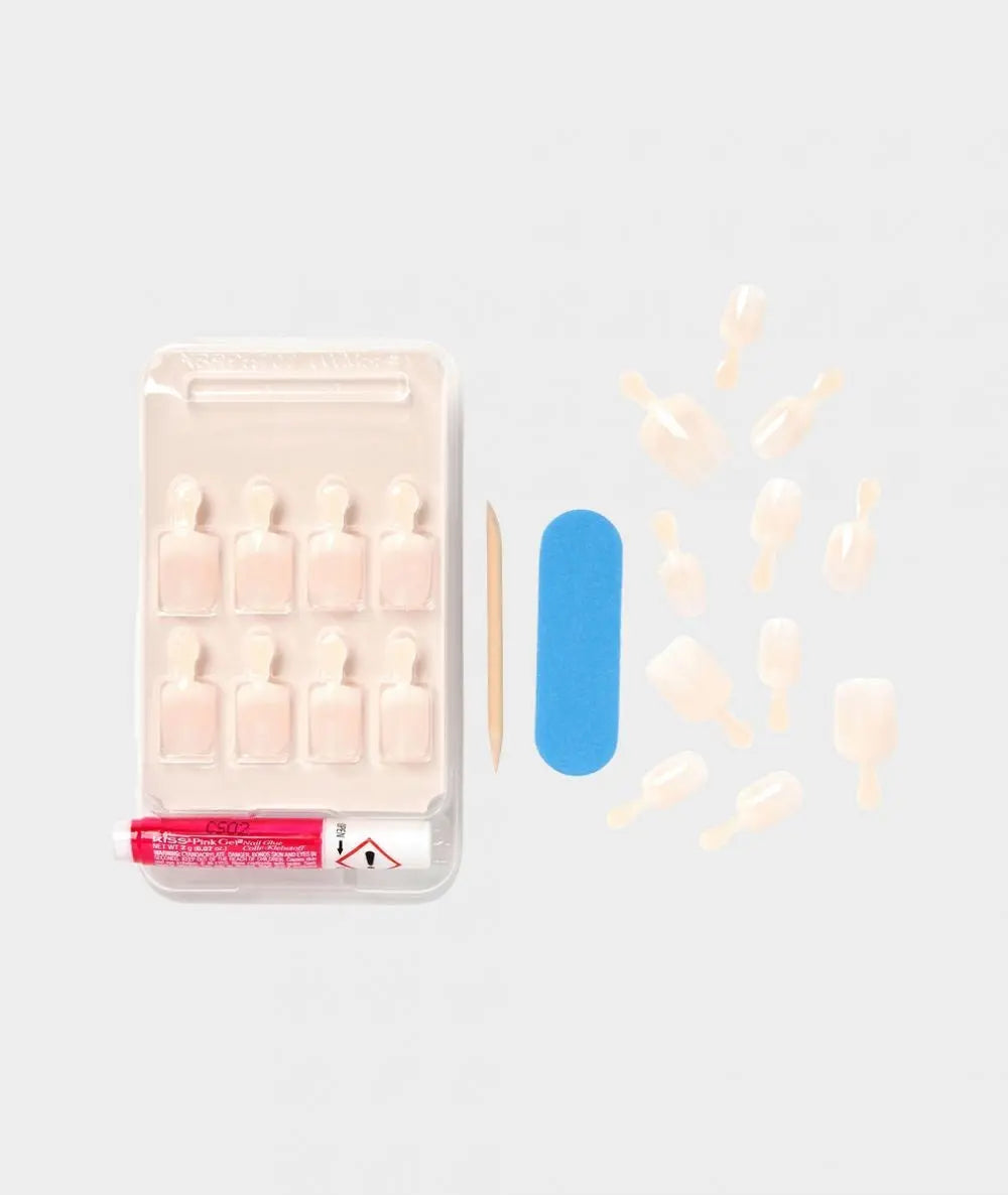 - Breng een dun laagje nagellijm aan op de achterkant van de kunstnagel en de eigen natuurlijke nagel.