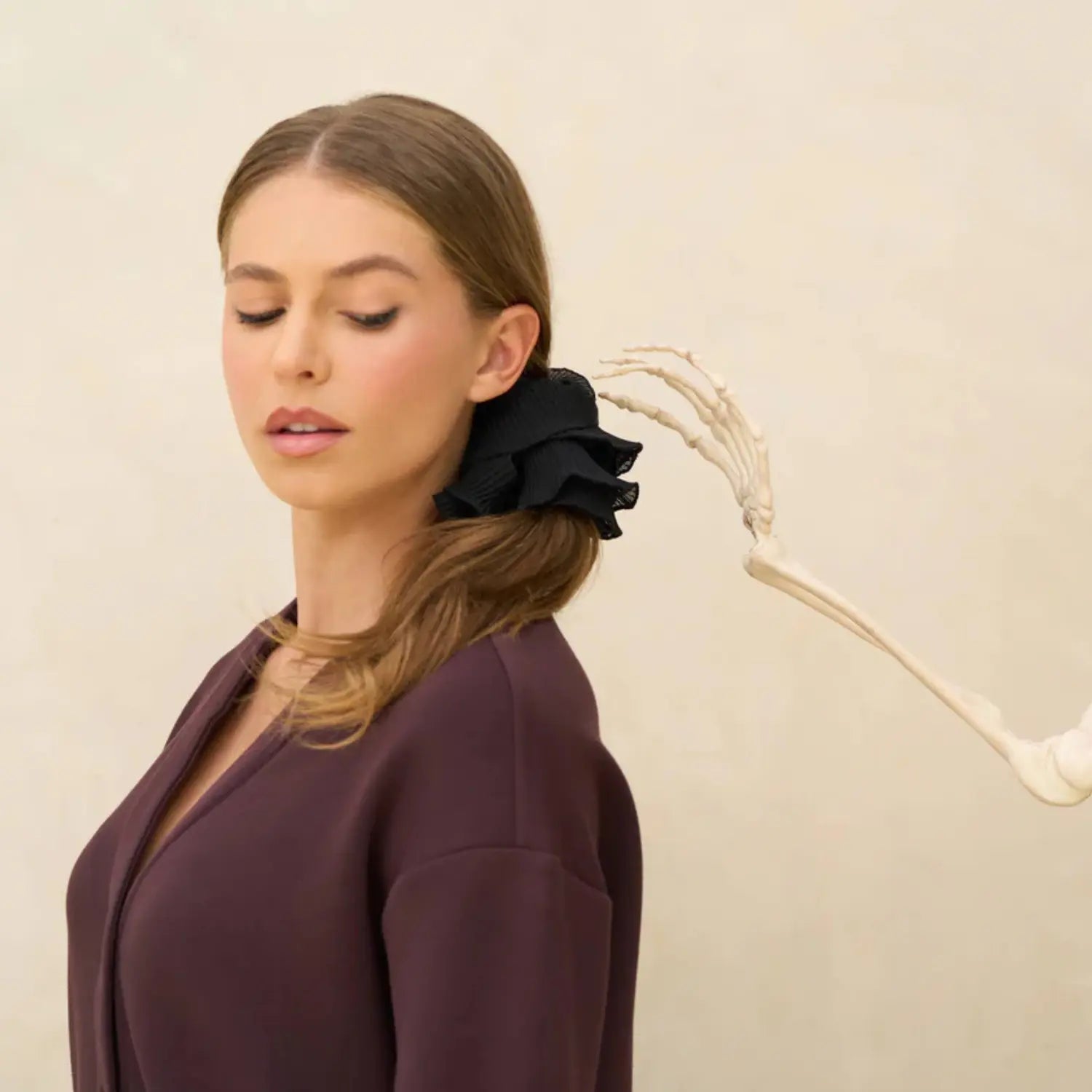 De diepe zwarte kleur en dramatische plooien geven elke look een bold en mysterieuze touch. Zacht voor je haar en toch stevig genoeg om alles op z’n plek te houden, zonder te trekken of schade aan te richten. Draag ‘m in je staart, knot of gewoon om je pols als statement-accessoire. Perfect voor Halloween-outfits, maar stiekem ook het hele jaar door een chic toevoeging!