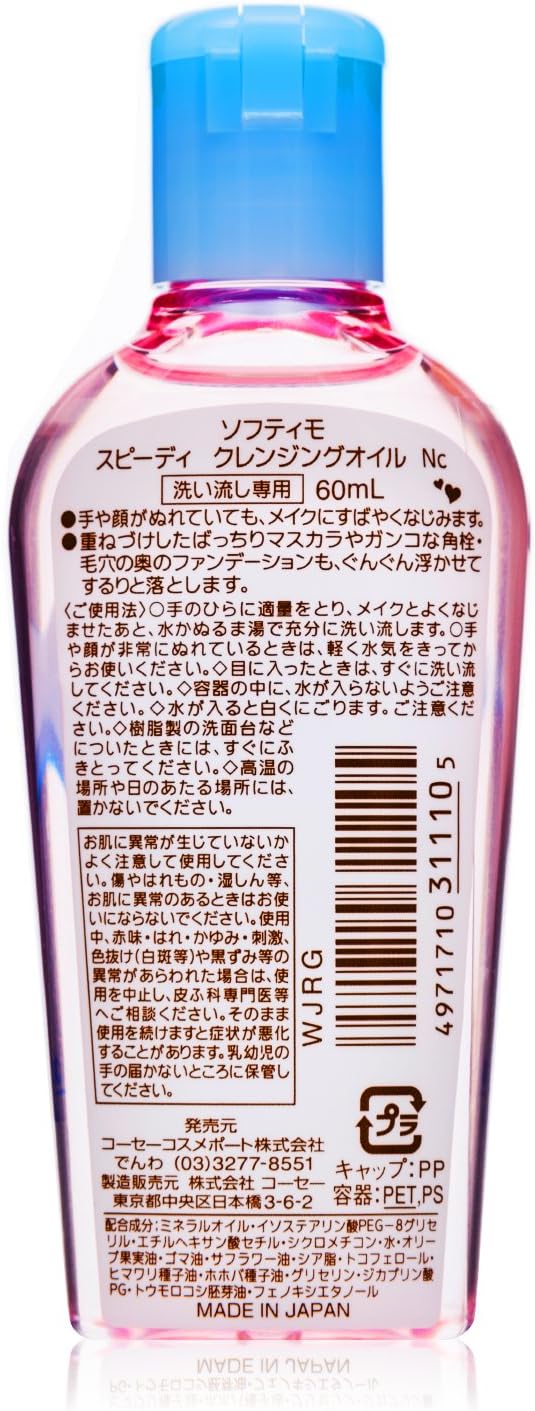 De Kose Softymo Speedy Cleansing Oil 60 ml. is een reinigde olie dat je huid grondig zal reinigen en zuiveren zonder je huid te laten uitdrogen. Deze magische reinigingsolie is speciaal ontwikkeld om al je make-up, vuil en onzuiverheden in één handomdraai te verwijderen. De lichte en zijdezachte textuur glijdt moeiteloos over je huid en lost onmiddellijk alle sporen van make-up op, zonder je huid uit te drogen.