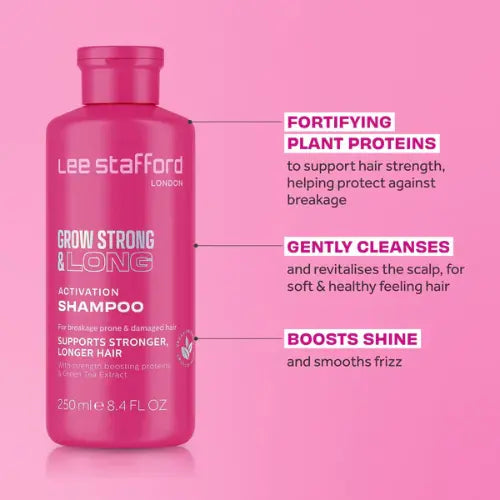 De Lee Stafford Grow Long & Strong Activation Shampoo is een echte musthave shampoo voor iedereen wiens haar nood heeft aan een extra boost! Deze shampoo stimuleert de haargroei en beschermt het haar. Het resultaat? Lange, sterke en gezonde lokken!