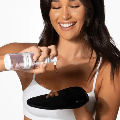 - Pomp een kleine hoeveelheid mousse op je Loving Tan Deluxe Applicator Mitt en verdeel het met ronddraaiende bewegingen over je huid.