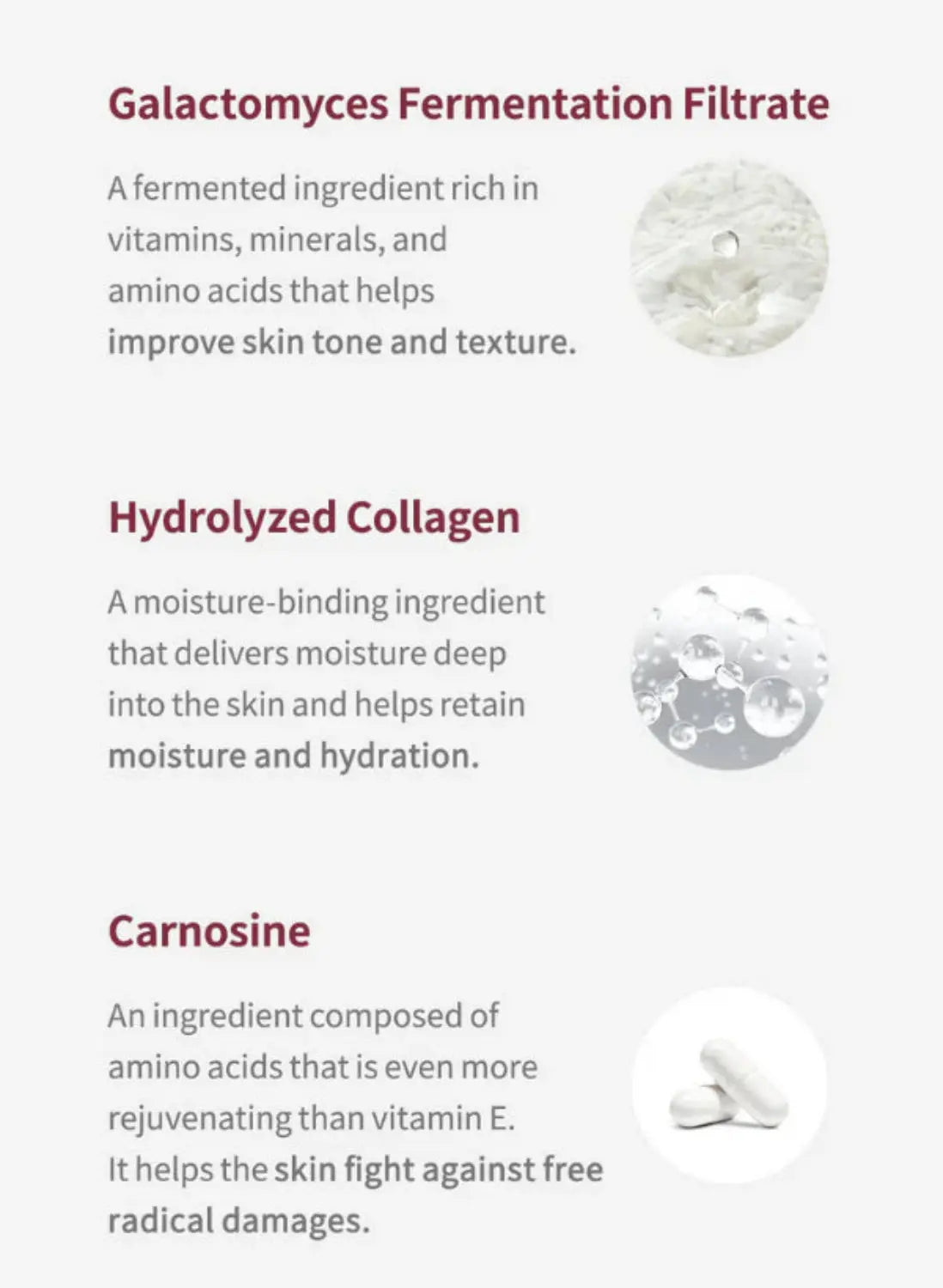 De crème bevat krachtige ingrediënten zoals Galactomyces die helpen bij het verbeteren van de huidtoon en textuur, gehydrolyseerd collageen dat zorgt voor langdurige hydratatie, en Carnosine om de huid te beschermen tegen externe schadelijke invloeden.